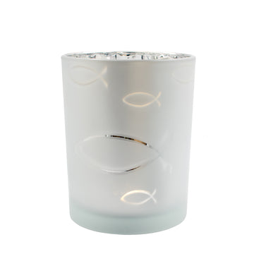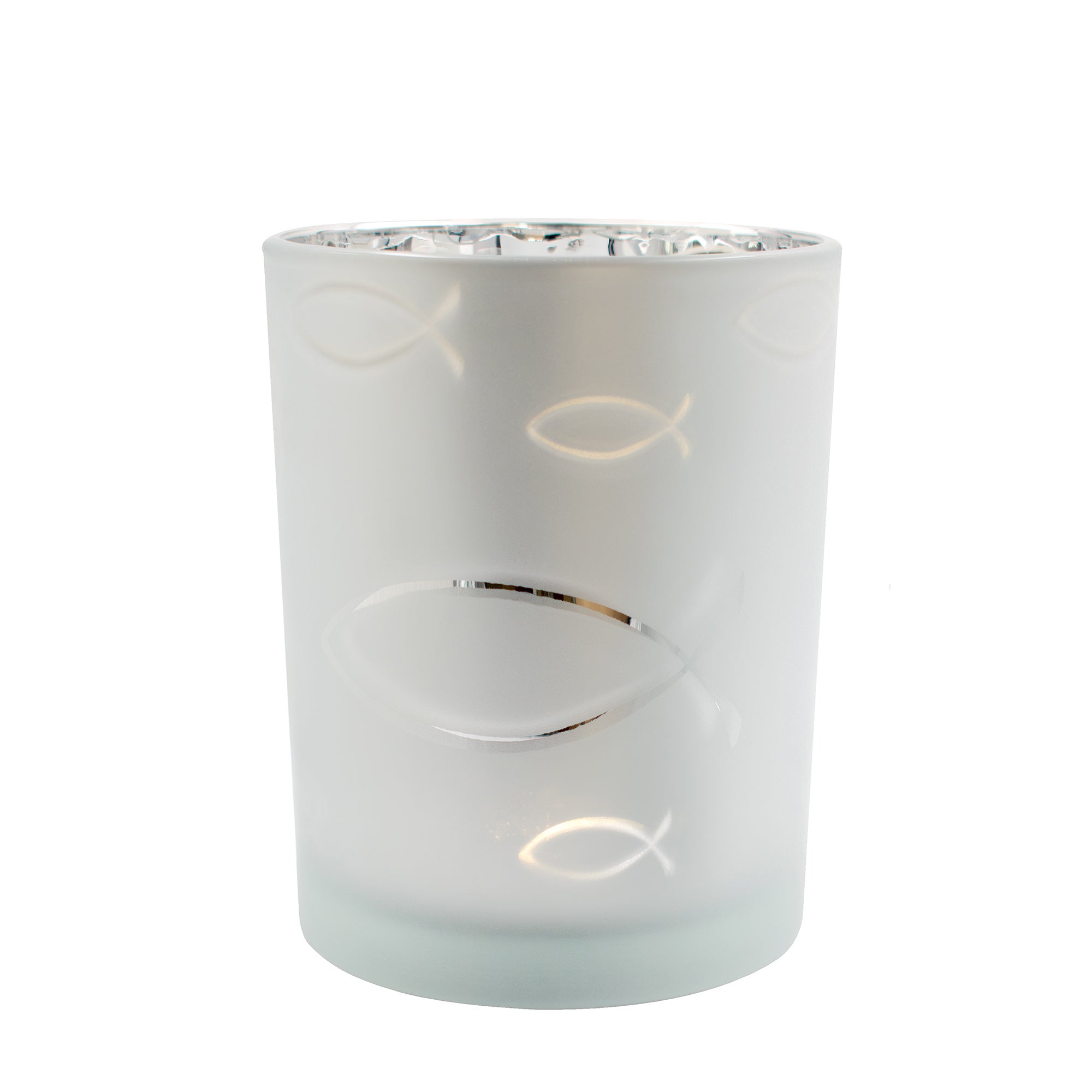 Ringsherum ist das Windlicht mit feinen Ichthys-Symbolen verziert, die bei einem leuchtendem Teelicht toll zur Geltung kommen.