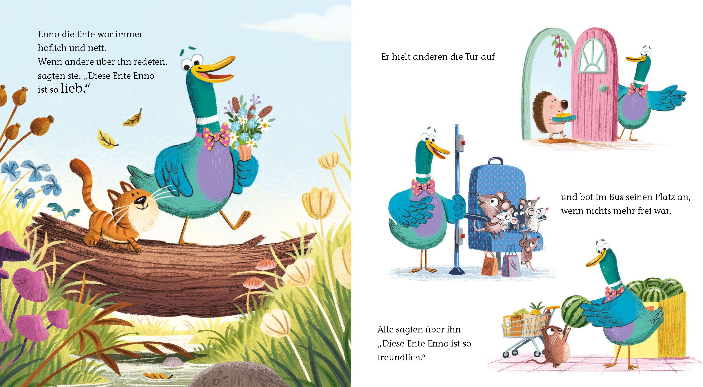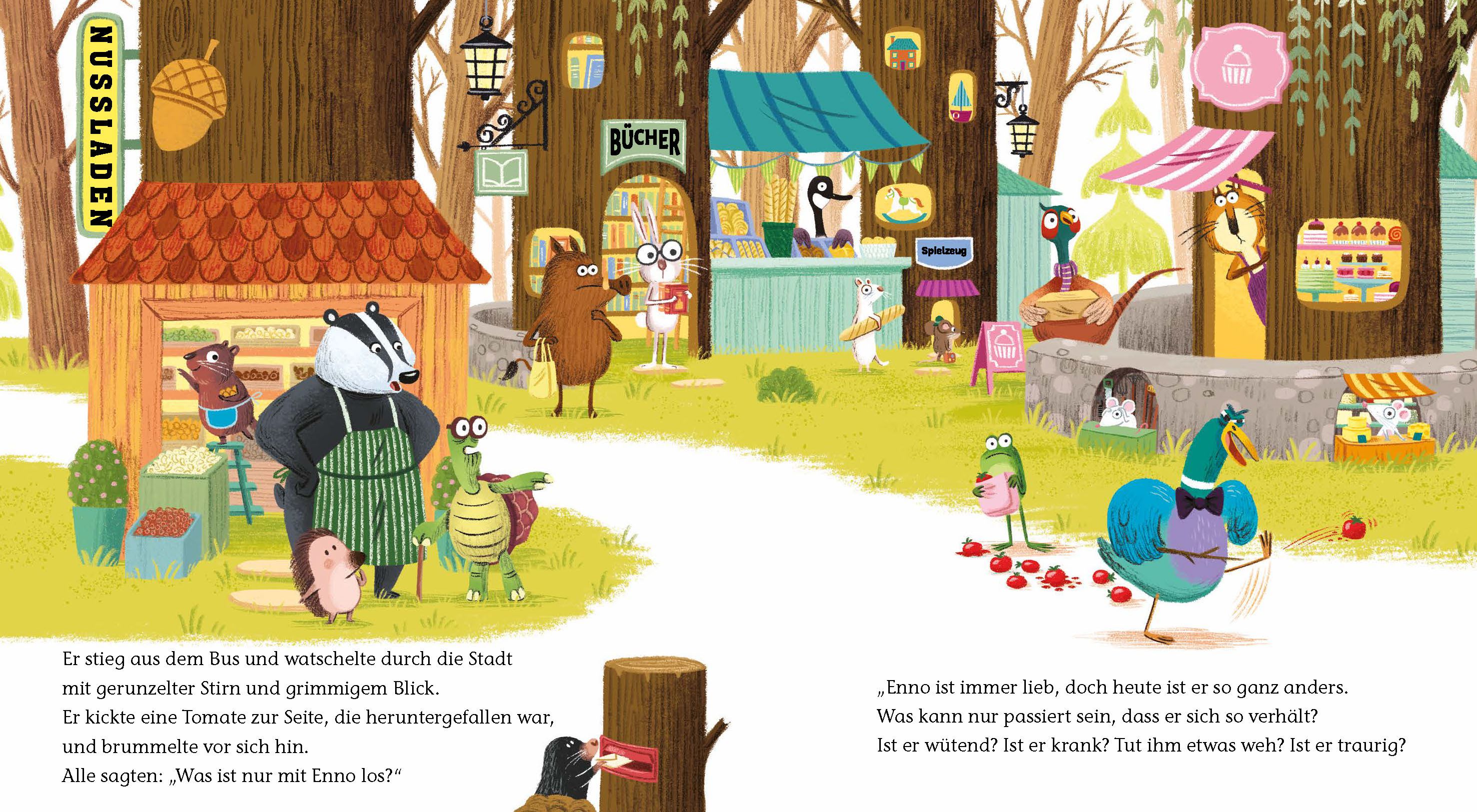 Enno die Ente ist bei allen Tieren beliebt, denn er ist immer freundlich und hilfsbereit, hört zu und steht mit Rat und Tat zur Seite. Doch heute fühlt er sich unzufrieden, stur und brummelig. Er muss wohl mit dem falschen Fuß aufgestanden sein. Seine Freunde wundern sich, dass Enno auf einmal gar nicht so nett ist, und sie beschließen ihm zu helfen. Schließlich kann jeder mal einen schlechten Tag haben. Also regen sie sich nicht auf, sondern sind gemeinsam für ihn da. Sie schweigen mit ihm, spielen mit ihm und geben ihm eine Schulter zum Anlehnen.