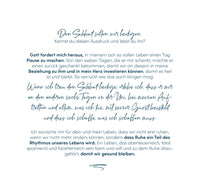 Das Aufstellbuch enthält ein Blatt für jede Woche des Jahres. Die gestaltete Vorderseite regt mit einem kurzen Spruch zum Nachdenken an, auf der Rückseite des Blattes findest du einen Text, der den Gedanken weiterführt.