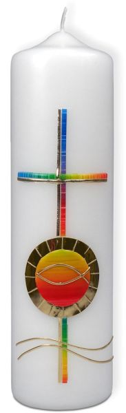 Kerze - mit Regenbogenkreuz und Ichthys-Symbol