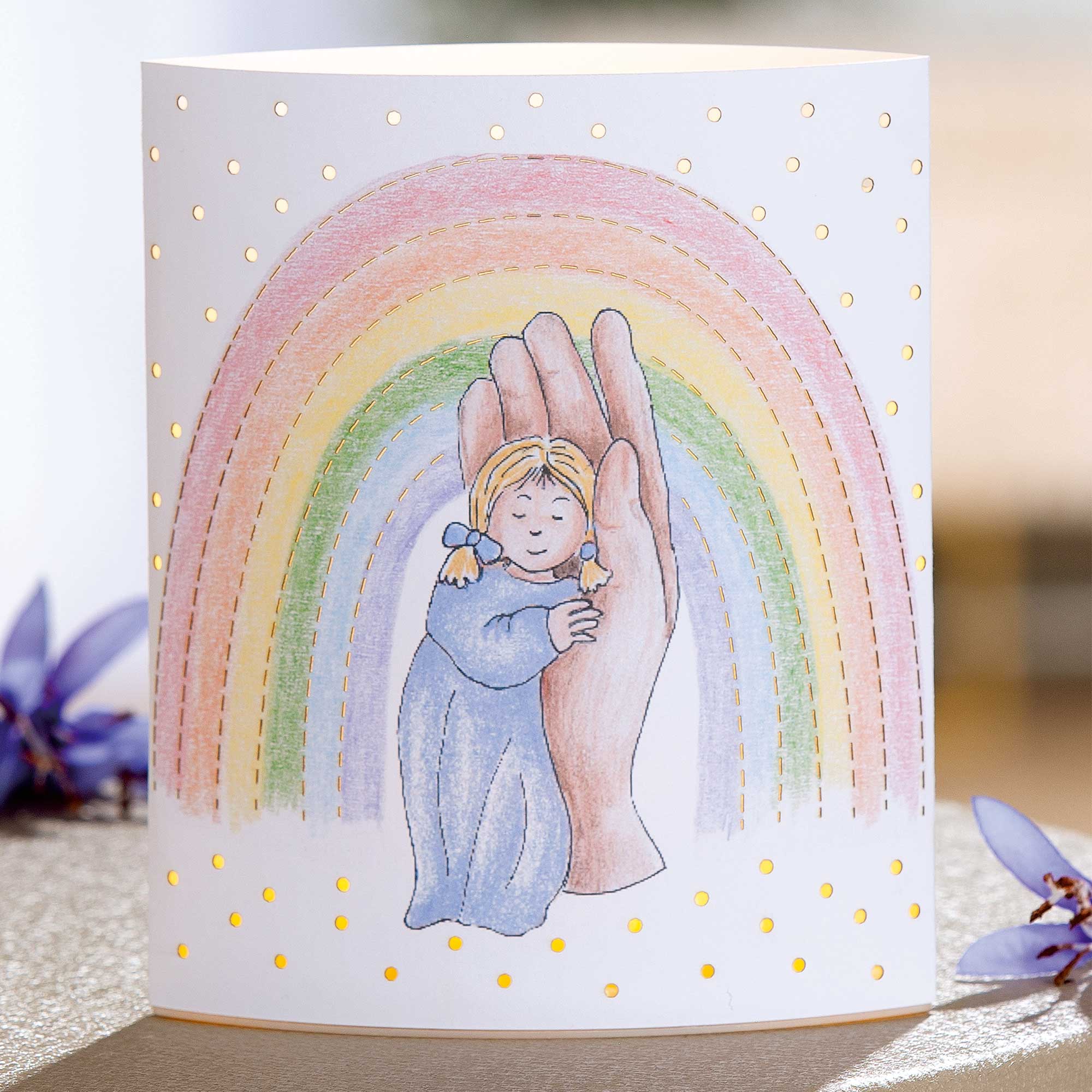 Papier-LED-Dekoleuchte "Kind in Hand mit Regenbogen"