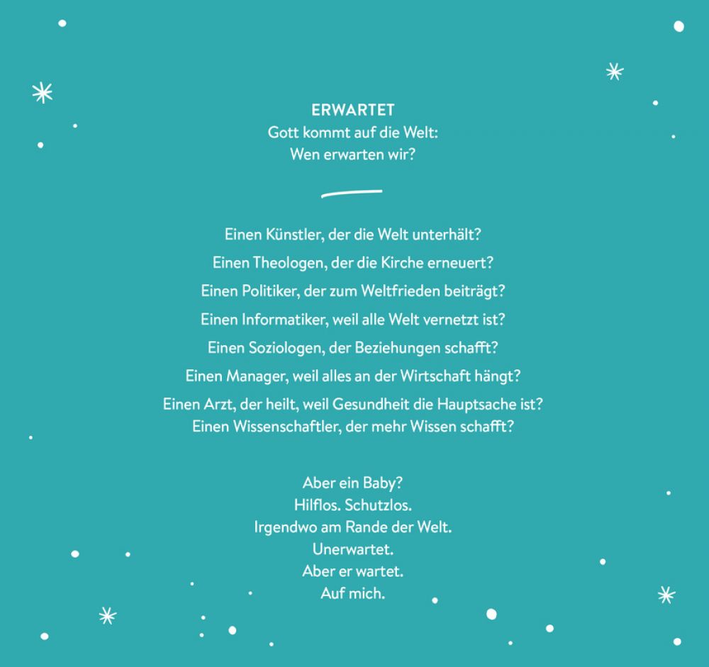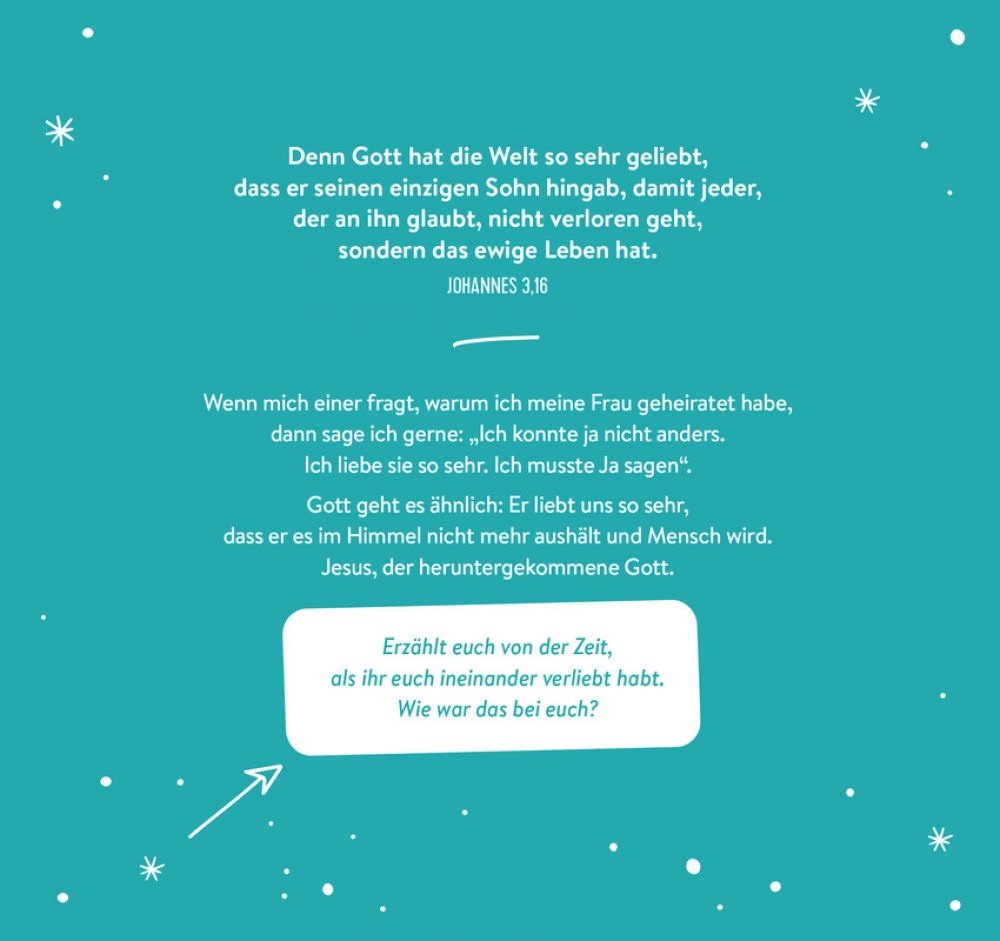 Was wäre, wenn die Adventszeit zu einer ganz besonderen, einer kostbaren Zeit für Sie als Paar werden würde? Denn mit Maria und Josef spielt ja auch ein Paar eine ganz wesentliche Rolle in der Weihnachtsgeschichte.Dieser Adventskalender zum Aufstellen bringt Sie auf besondere Weise miteinander ins Gespräch: durch kurze Impulse, spannende Fragen und Gedanken zum Weiterdenken.