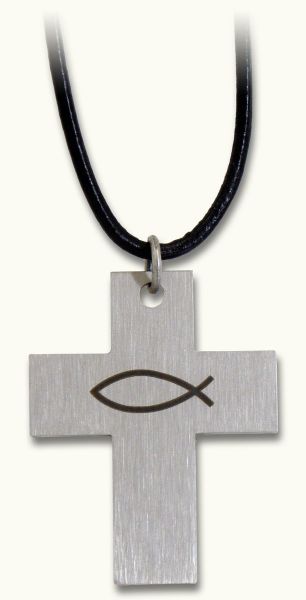 Kreuz Edelstahl mit Fisch - Halskette an Lederschnur