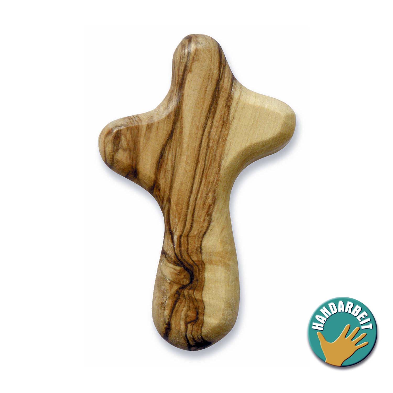 Kreuz als Handschmeichler aus Olivenholz, ergonomische Form, 4 x 6 cm
