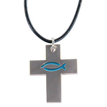 Kreuz mit Fisch am Leder-Halsband (Fischsymbol blau)