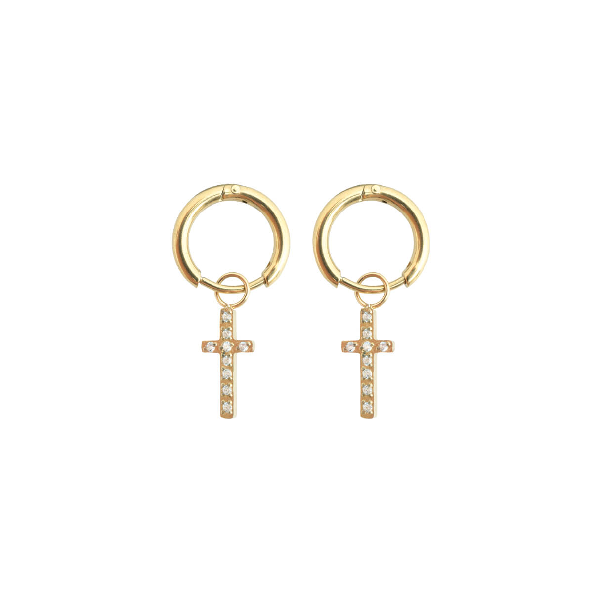 Zierliche Creolen mit Kreuz-Anhänger aus hochwertigem goldfarbenen Edelstahl.