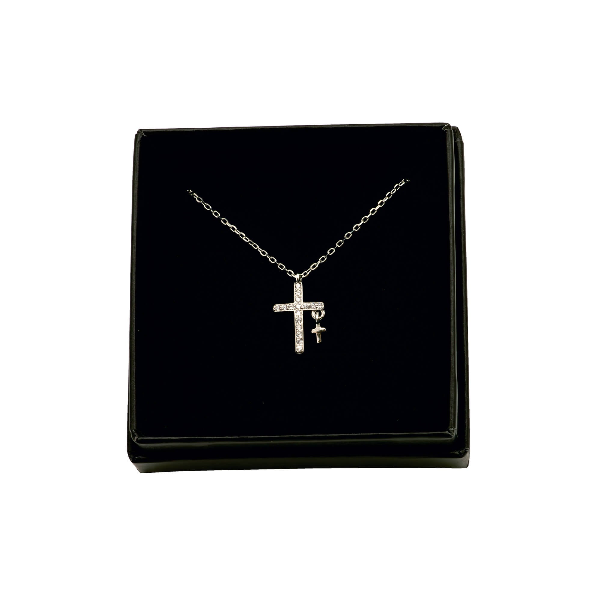 925er Silberkette mit Anhänger aus großem und kleinem Kreuz; das große Kreuz ist verziert mit funkelnden Zirkonia-Steinen.