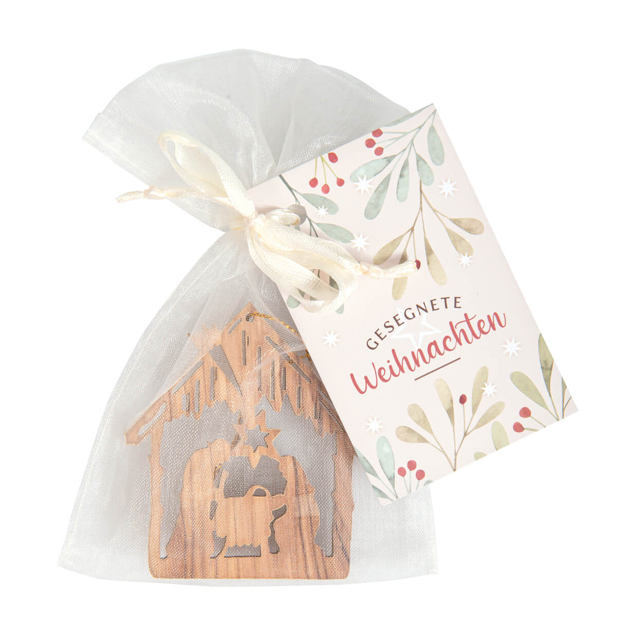 Schöner Baumschmuck aus Olivenholz, Handarbeit aus Bethlehem mit aufwändig gelaserten Motiven.