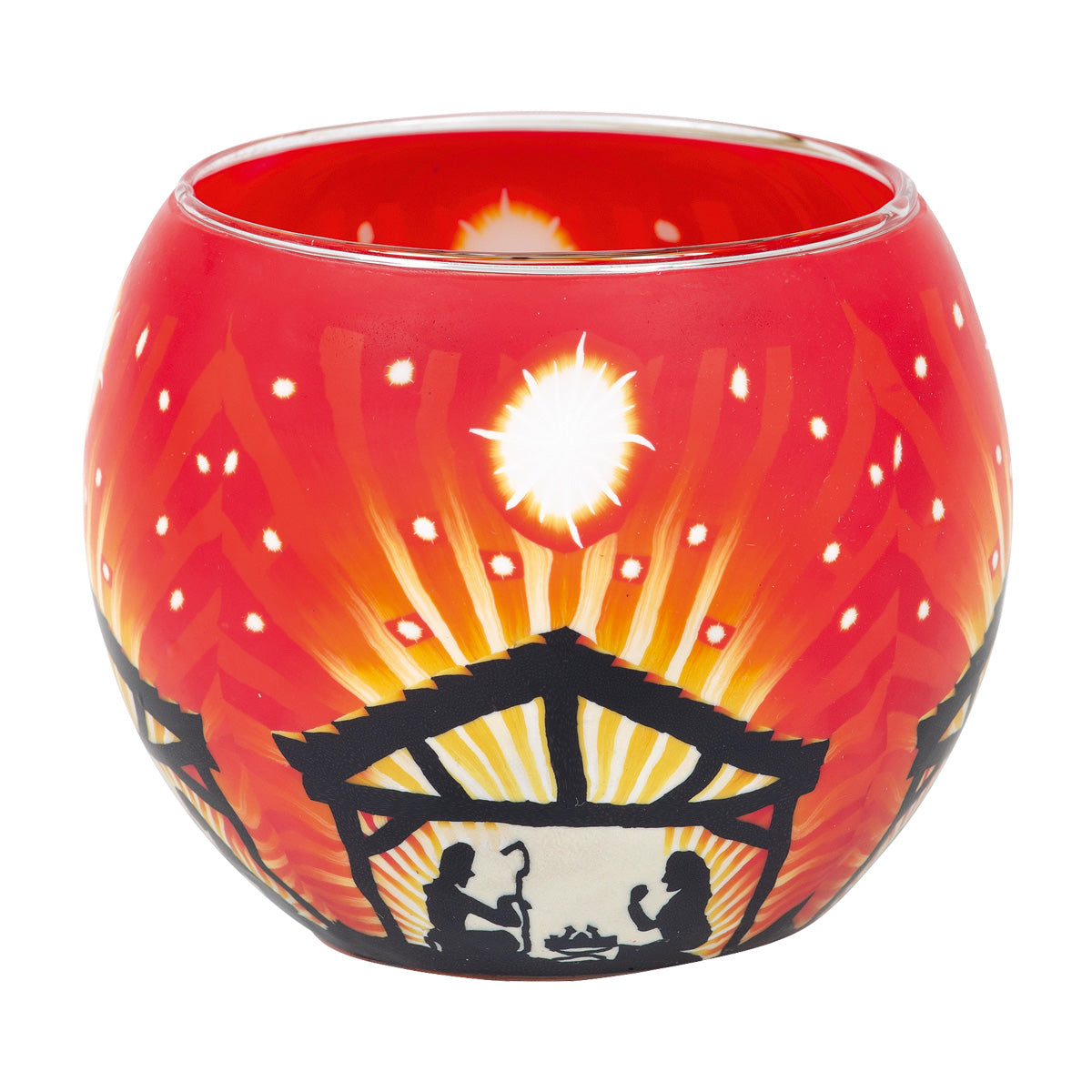 Leuchtglas mit stimmungsvoller, farbiger Krippenszene in Scherenschnitt-Optik.