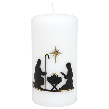 Kerze mit moderner Darstellung der weihnachtlichen Krippe.