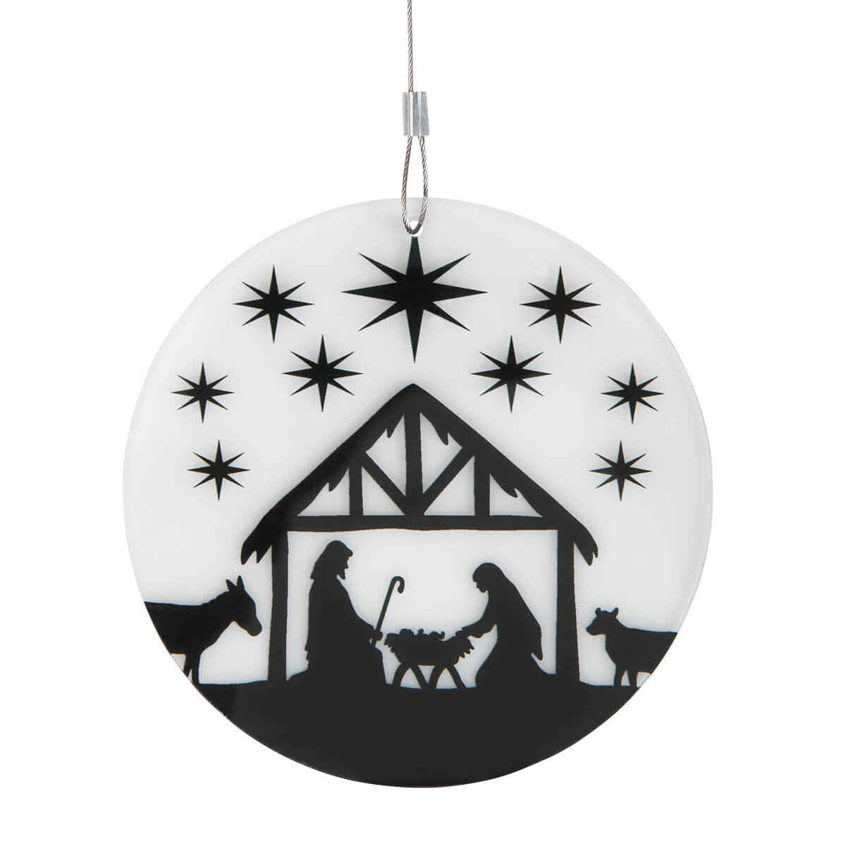 Schlicht und effektvoll: Runder Anhänger aus Acryl, einfarbig schwarz bedruckt mit moderner Krippeszene. Eine schöne Idee, um Fenster weihnachtlich zu dekorieren.