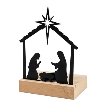 In einem Holzsockel steckt die Krippenszene aus schwarz lackiertem Metall und der Einsatz für ein Teelicht.