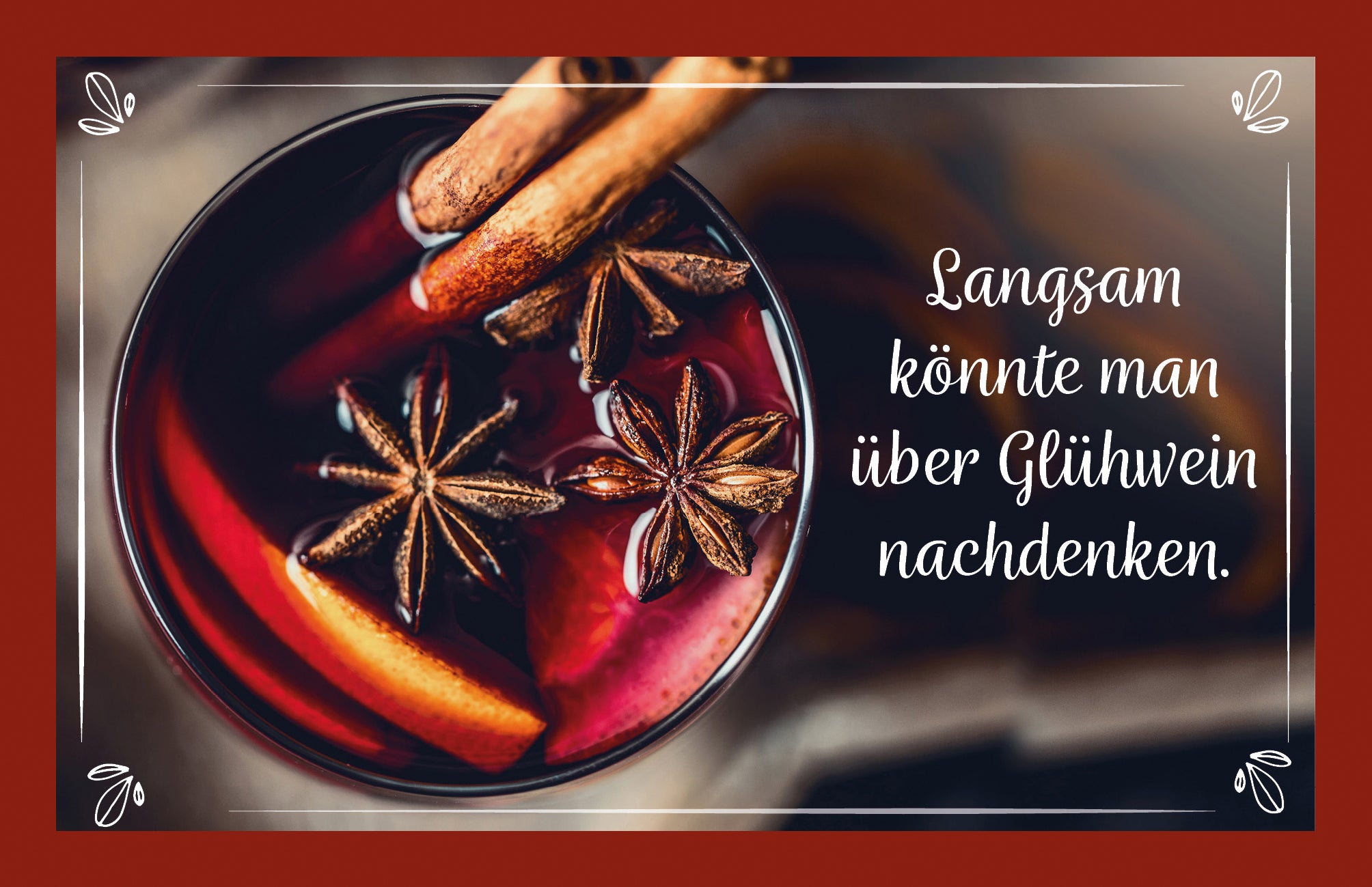 Wenn der Winter Einzug hält, es draußen frostig, nass und stürmisch wird, freut man sich, dass die warme Stube drinnen ist. Die Glühwein-Postkarte "Langsam könnte man über Glühwein nachdenken." mit der winterlichen Glühweingewürzmischung kommt da genau richtig. Einfach mit Rotwein oder Tee erhitzen, kurz ziehen lassen und schon weht Ihnen der feine Duft von Glühwein um die Nase. Senden Sie diese Karte an liebe Menschen und verschenken Sie damit einen genussreichen Wintertraum.