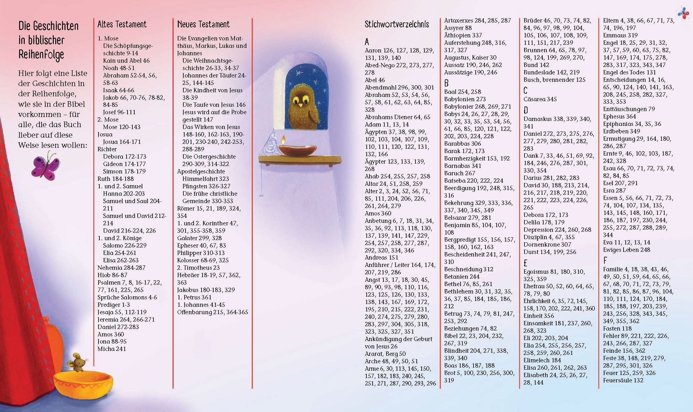Sehr hilfreich sind das enthaltene Stichwort-Verzeichnis und ein Verzeichnis der Geschichten in der Reihenfolge der biblischen Bücher. Auf diese Weise kann man schnell gezielt einzelne Themen und Geschichten auswählen.