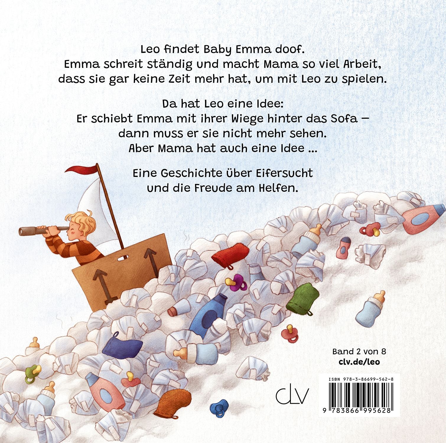 Da hat Leo eine Idee: Er schiebt Emma mit ihrer Wiege hinter das Sofa - dann muss er sie nicht mehr sehen. Aber Mama hat auch eine Idee Eine Geschichte über Eifersucht und die Freude am Helfen.