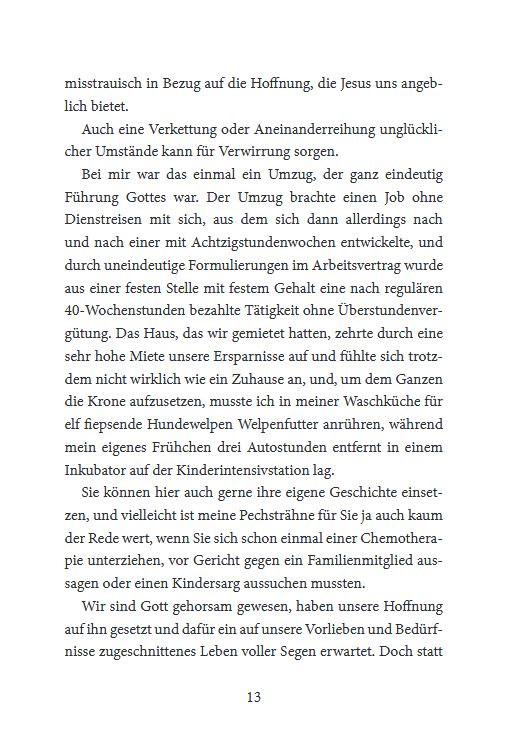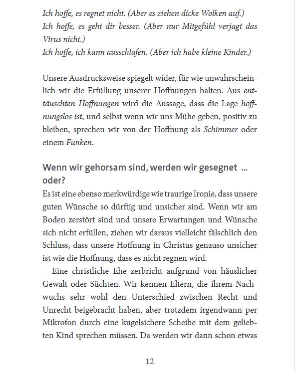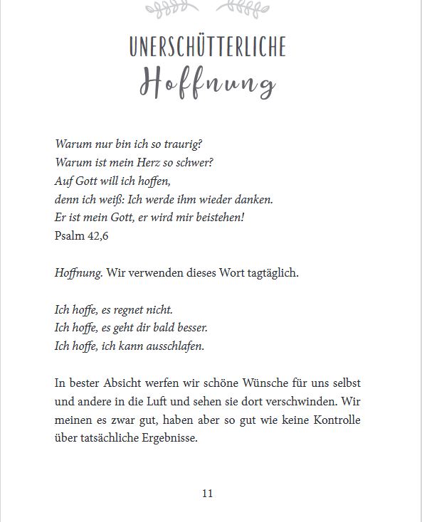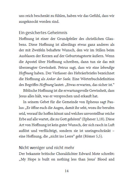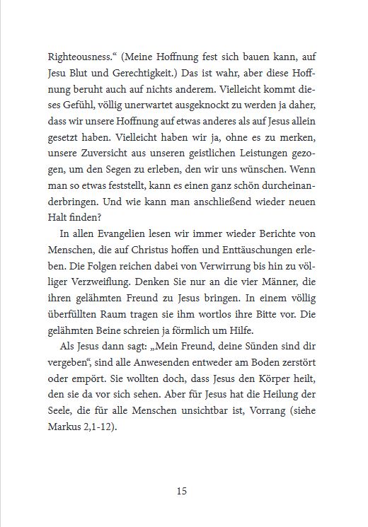 Die Autorin erzählt acht bekannte biblische Geschichten aus dem Neuen Testament nach. Sie berichtet, wie Jesus es schaffte, die Hoffnung dieser Personen neu zu entfachen und ihnen eine positive Perspektive zu geben. Indem sie die Geschichten mit kulturellen und historischen Details ausschmückt, werden die Personen für die Leser nahbarer, und gleichzeitig finden sie Hoffnung für ihr eigenes Leben. Dies erreicht sie dadurch, dass sie die Leser zur Anwendung des Gelesenen auf ihr persönliches Leben hinführt. Damit werden die Episoden zu einem praktischen geistlichen Ratgeber für die heutige Zeit.