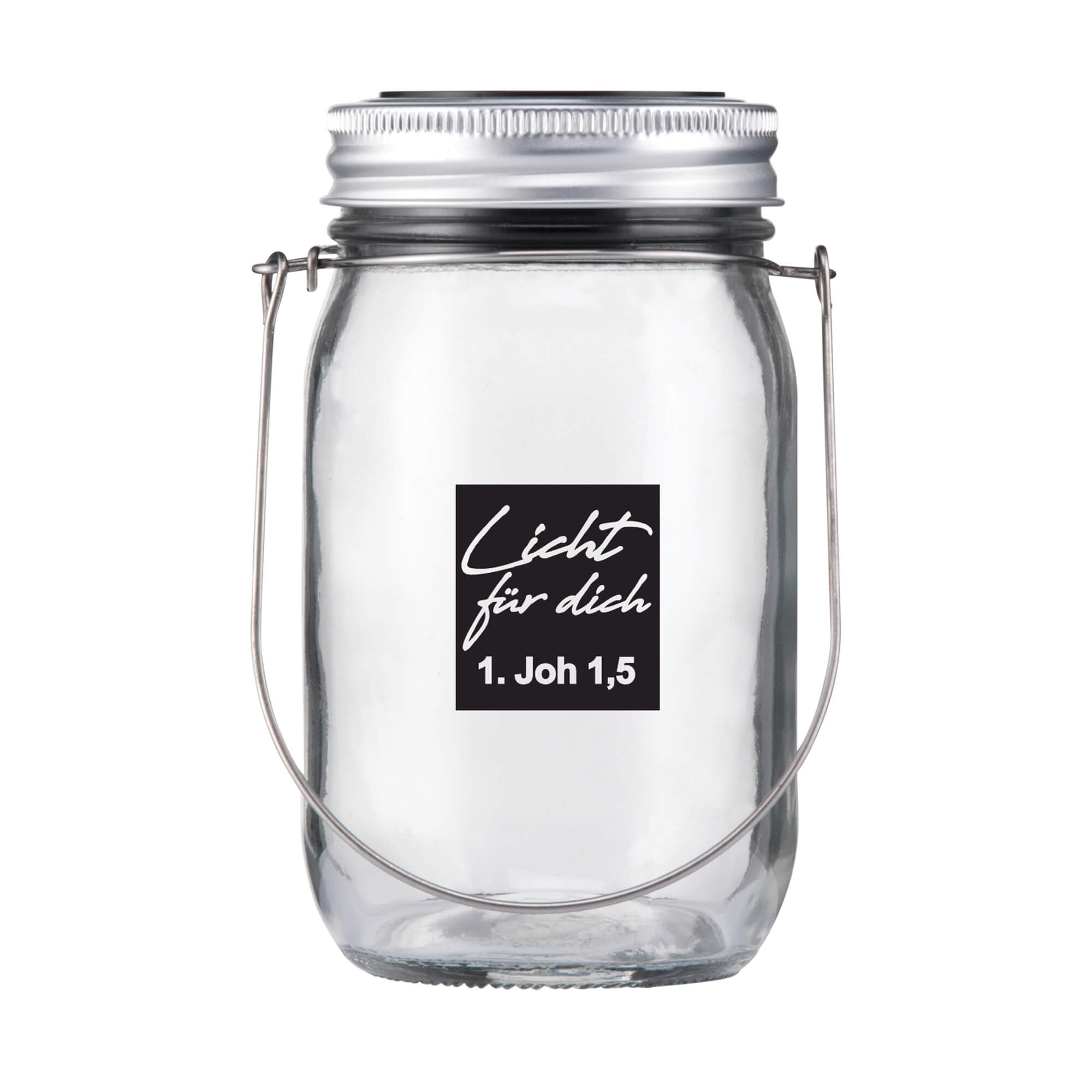 Der Text "Licht für dich - 1. Joh 1,5" ist auf der rechteckig bedruckten Fläche ausgespart und kommt durch die von innen beleuchtete Lampe besonders gut zur Geltung.