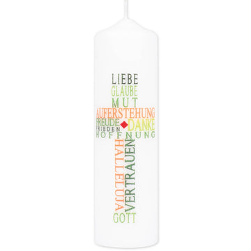 Weiße Osterkerze mit Worten wie Liebe, Auferstehung, Glaube, Mut ...geformt zu einem Kreuz.