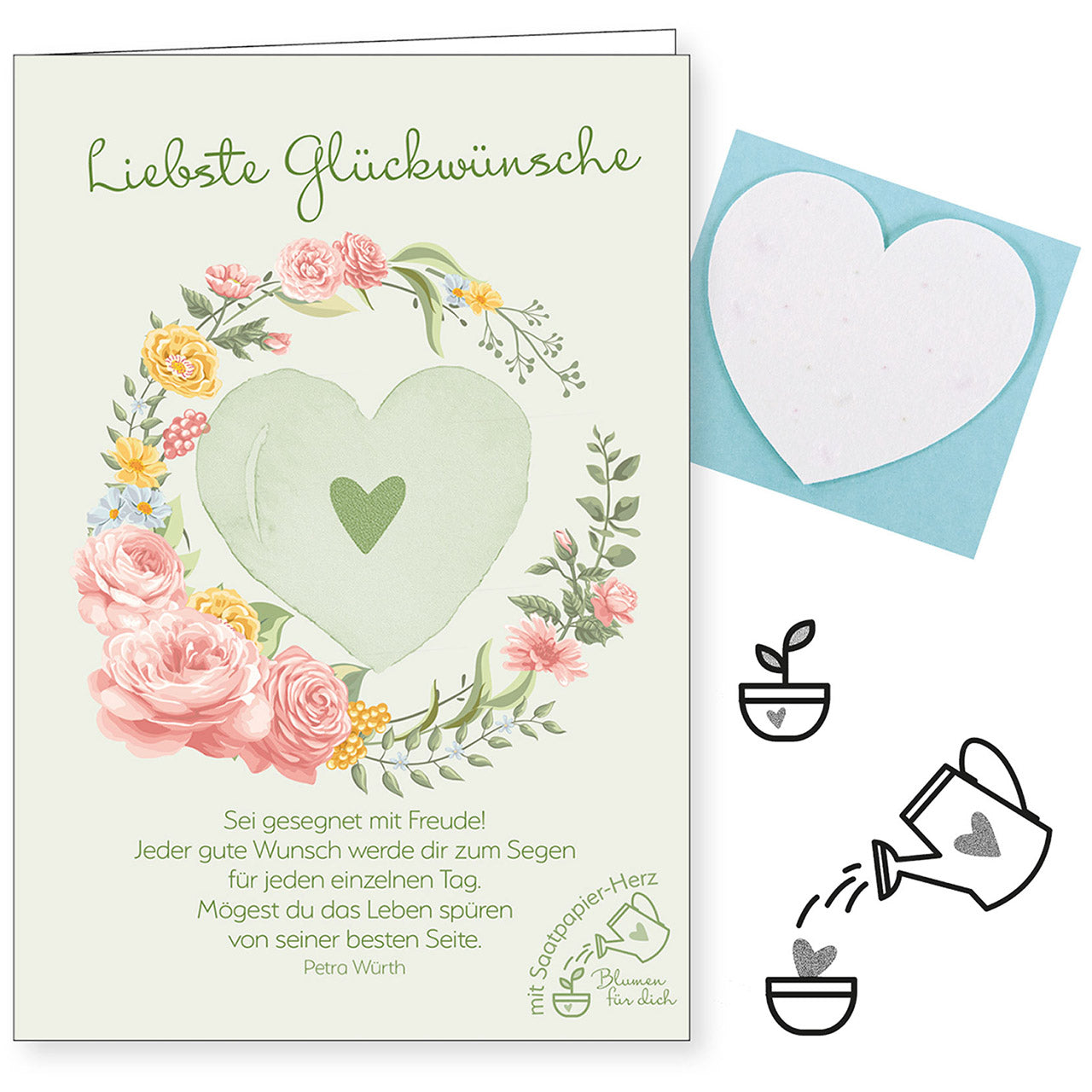 Neben wohltuenden Wünschen trägt sie ein Herz aus Samenpapier, das eine kleine bunte Mischung aus Wildblumen verheißt.