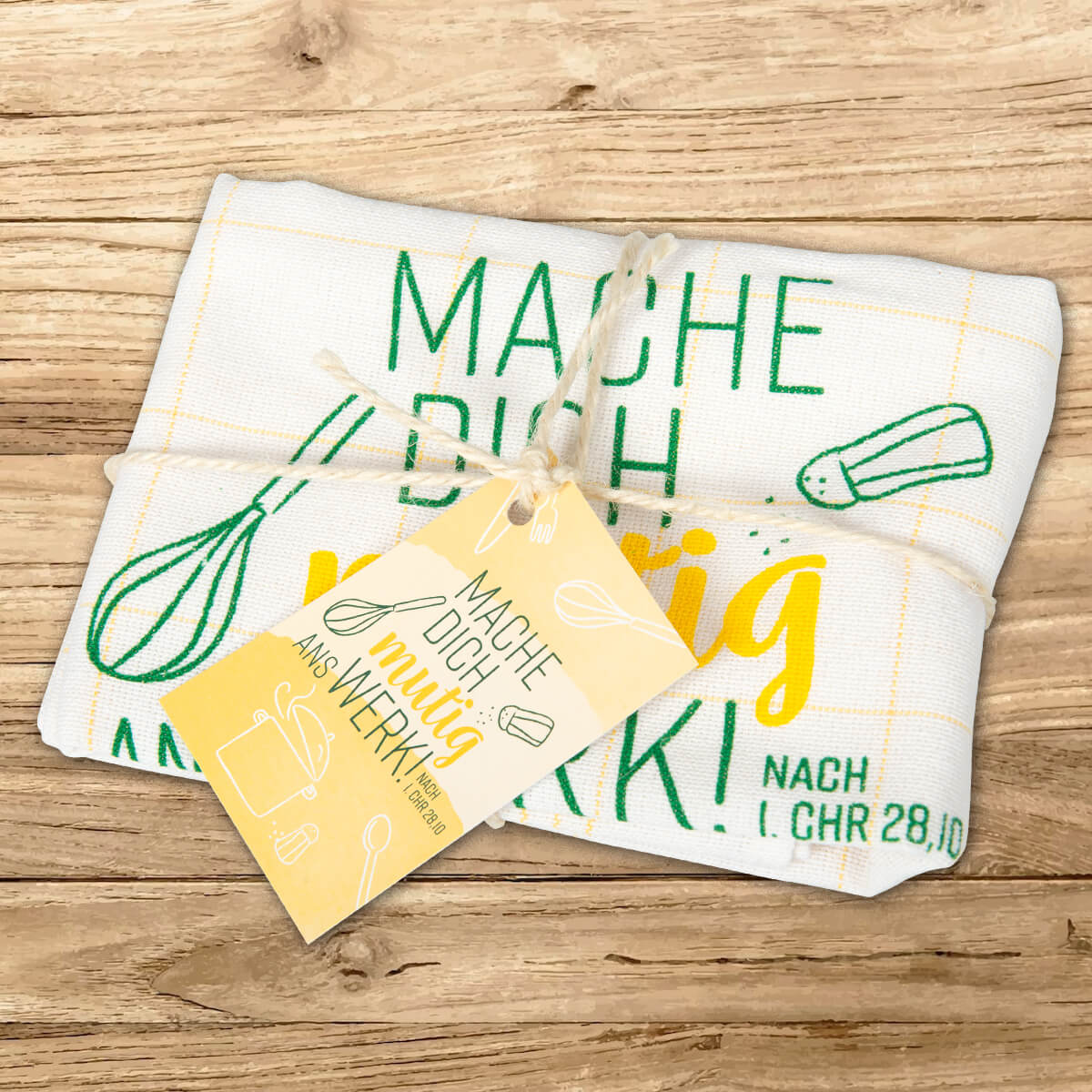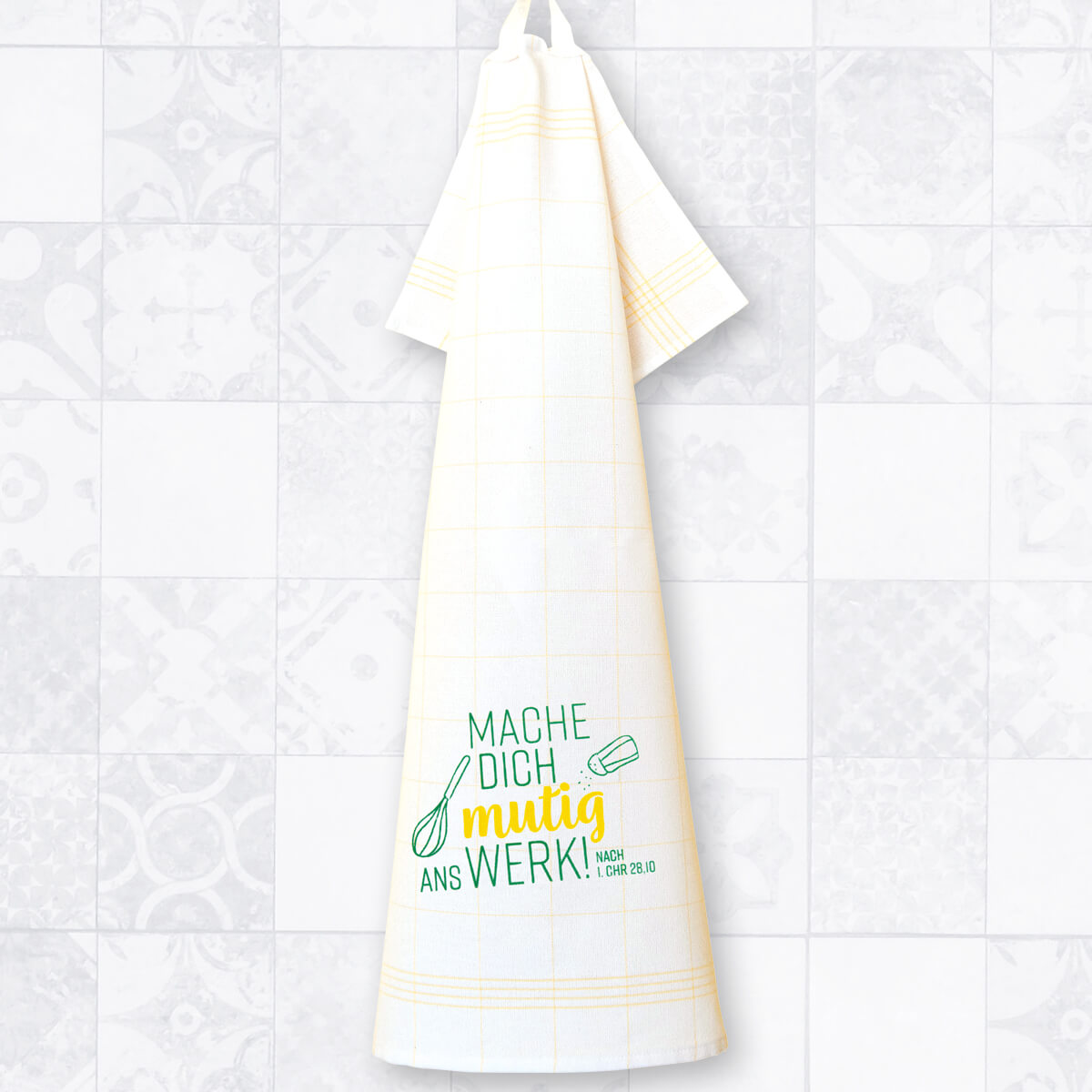 Gelb kariertes Geschirrtuch aus 100 % Baumwolle, zweifarbig bedruckt mit dem Vers "Mache dich mutig ans Werk! nach 1. Chr. 28,10"
