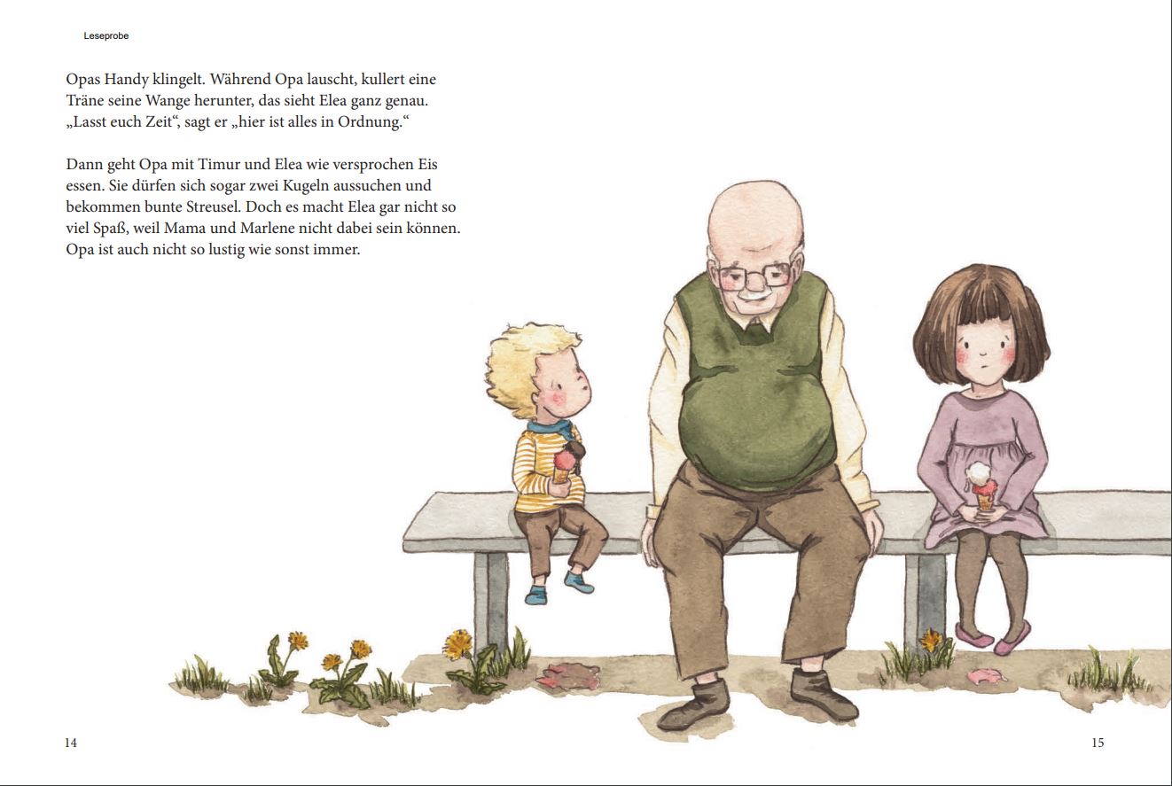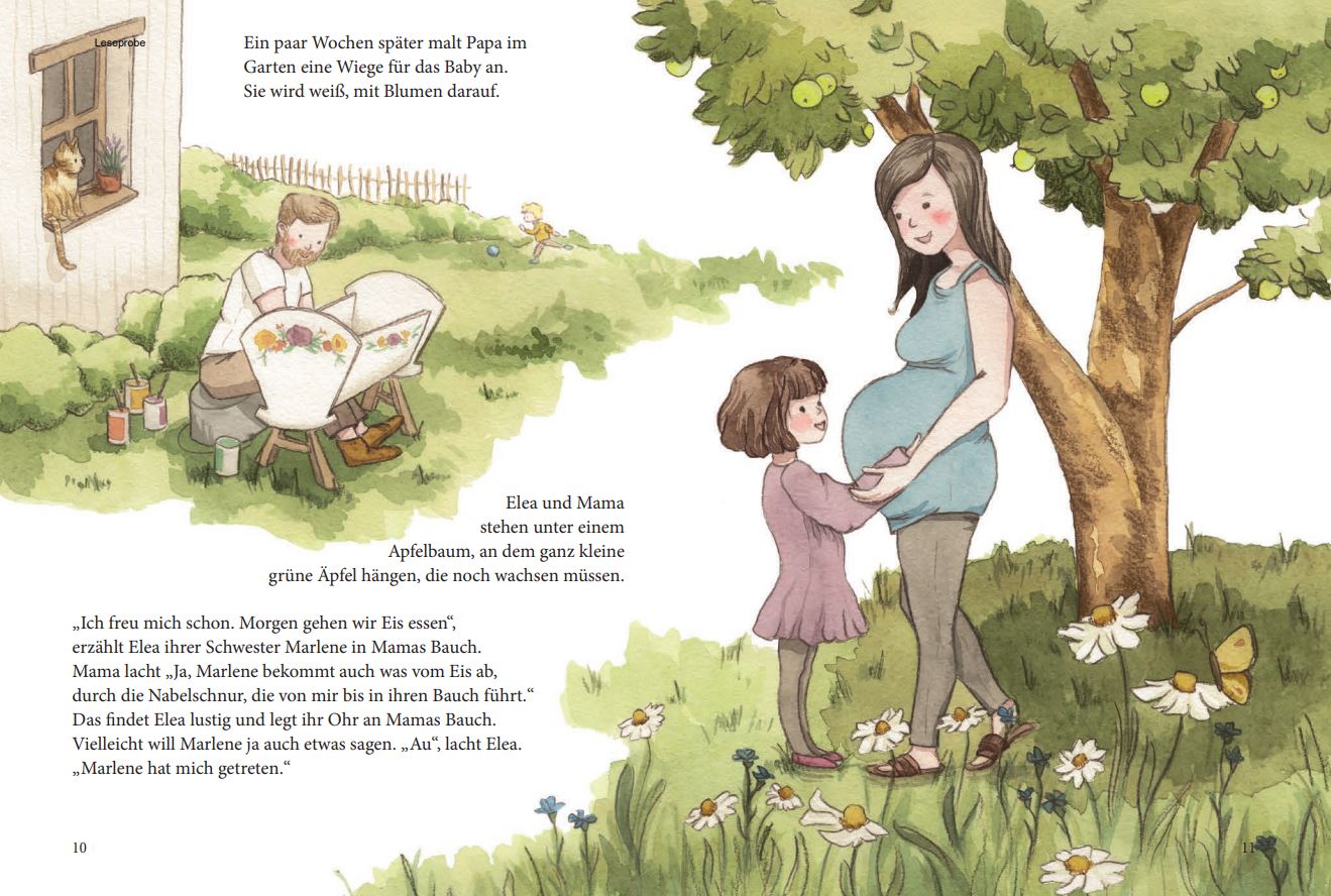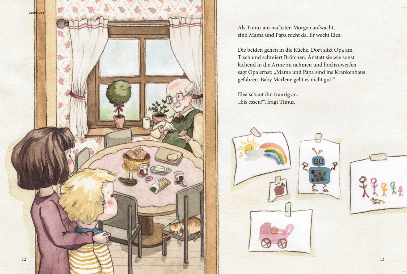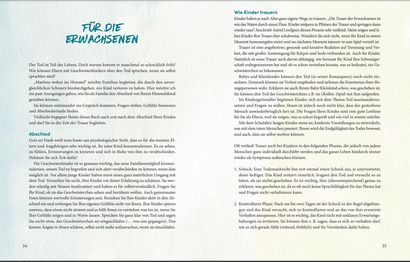 Die vierjährige Elea und ihr zweijähriger Bruder Timur freuen sich auf ihr neues Geschwisterchen. Noch ist ihre kleine Schwester Marlene in Mamas Bauch, der immer größer wird. Doch eines Morgens fahren Mama und Papa ins Krankenhaus. Als sie zurückkommen, haben sie ein ganz kleines Baby mitgebracht, das nicht mehr lebt. Mama und Papa weinen und auch Timur und Elea sind traurig. In Ruhe nehmen sie als Familie Abschied. Später gibt es eine große bunte Abschiedsfeier für Marlene, die ab jetzt wie ihre Oma bei Gott im Himmel wohnt. Alle tröstet der Gedanke, die beiden dort einmal wieder zu sehen. Zu Marlenes erstem Geburtstag macht die ganze Familie ein Picknick auf der Wiese mit Kuchen und Geburtstagslied, denn Marlene bleibt für sie ein Teil ihrer Familie.