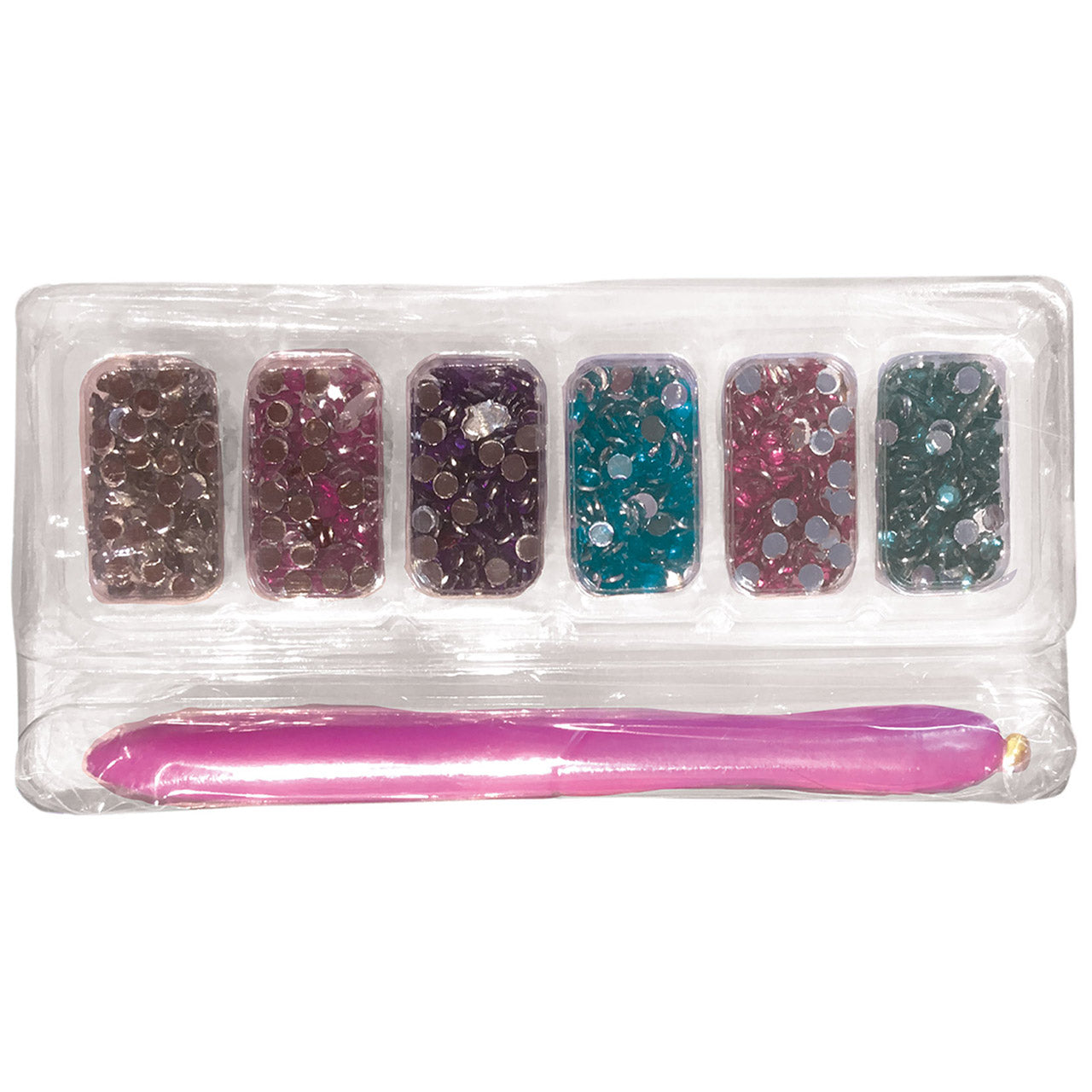 1 Motivbild (14,5 x 21 cm), 1 Haftstift zum Übertragen der Glitzersteinchen und ca. 540 farbig passende Glitzersteinchen.
