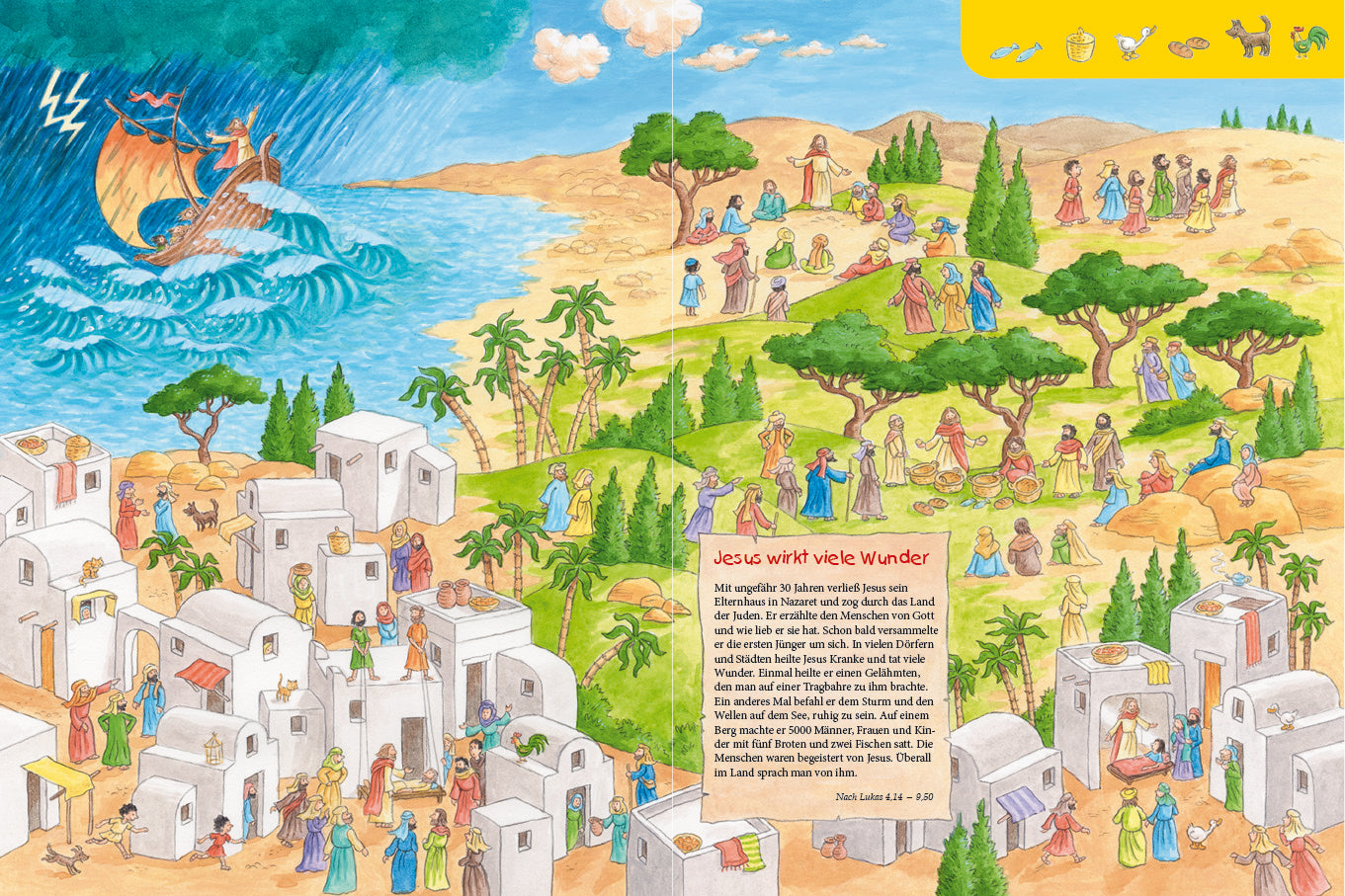 Dieses großformatige Pappbilderbuch wird den Forscherdrang in Ihren Kleinen entfesseln! Die ebenso lustigen wie detailreichen Darstellungen des biblischen Geschehens laden dazu ein, tief in die Welt der biblischen Geschichten einzutauchen. Auf je einer Doppelseite werden zentrale Geschichten des Neuen Testaments dargestellt. An den Bildrändern finden sich jeweils die Personen, Tiere und Dinge, die im Bild zu suchen sind. Außerdem gibt es auf jeder Doppelseite eine Nacherzählung der biblischen Geschichte. So lernen ihre Kleinen spielend leicht die Bibel immer besser kennen.