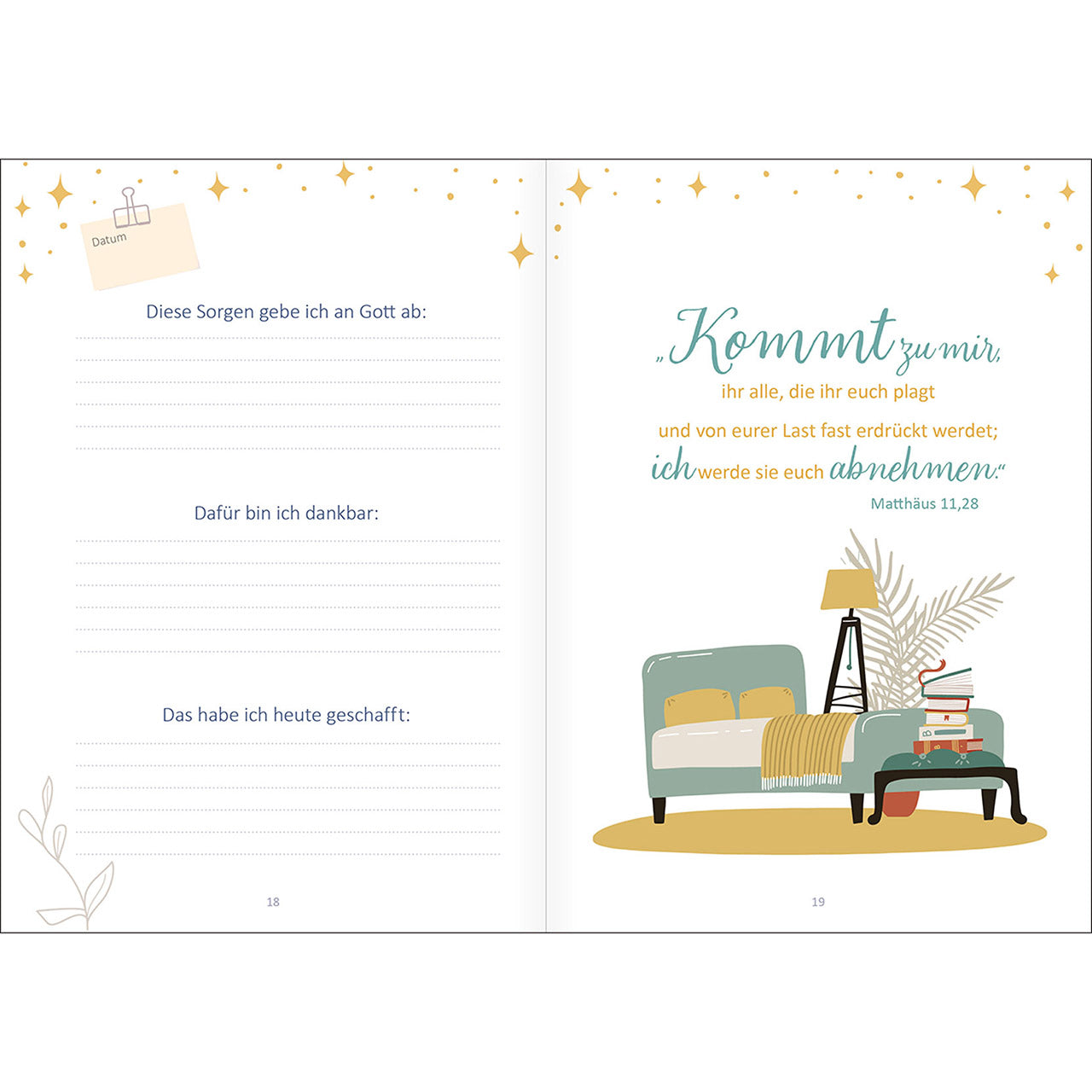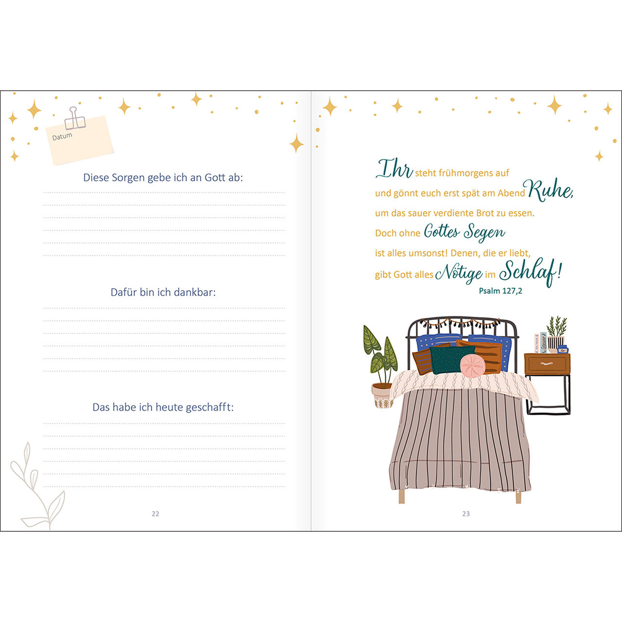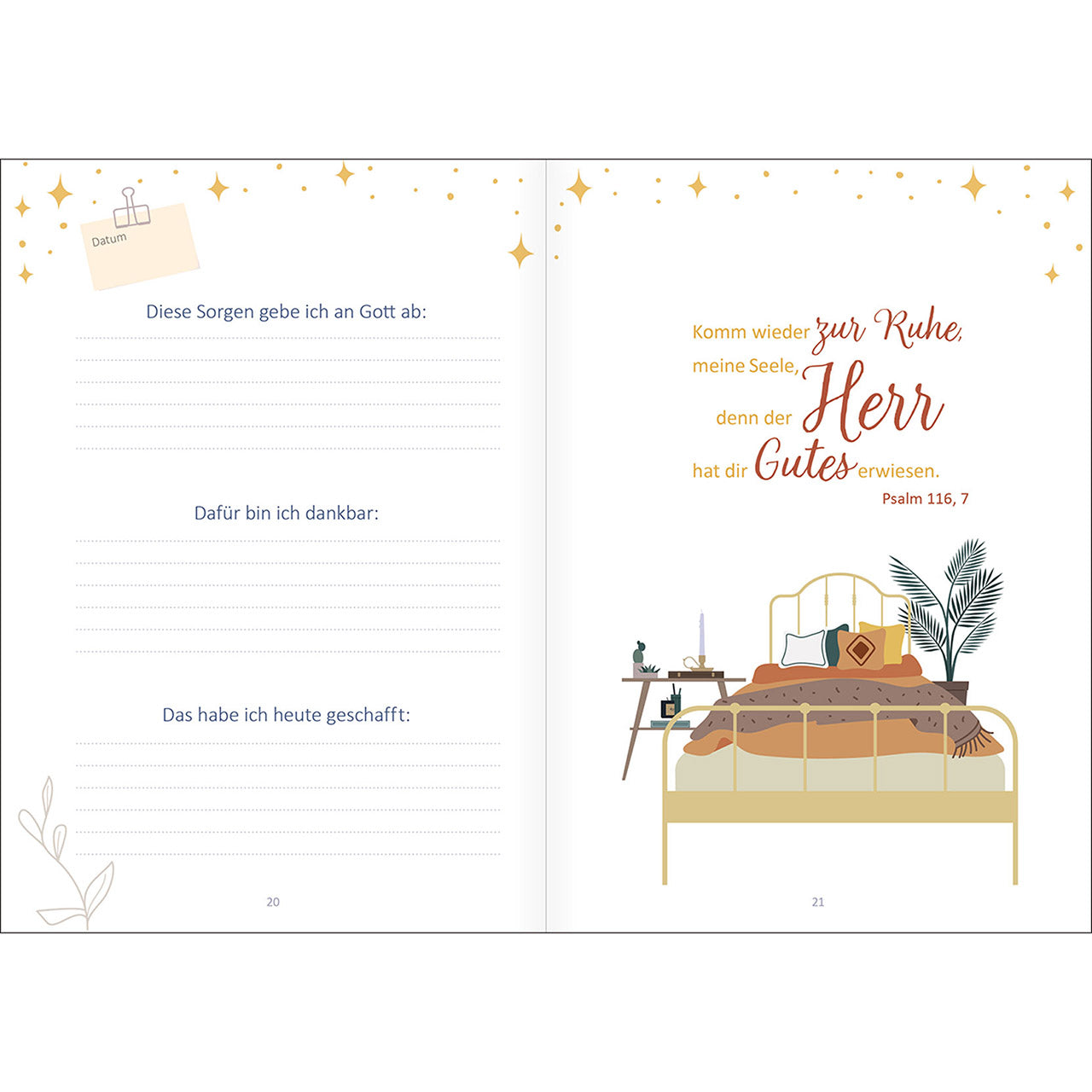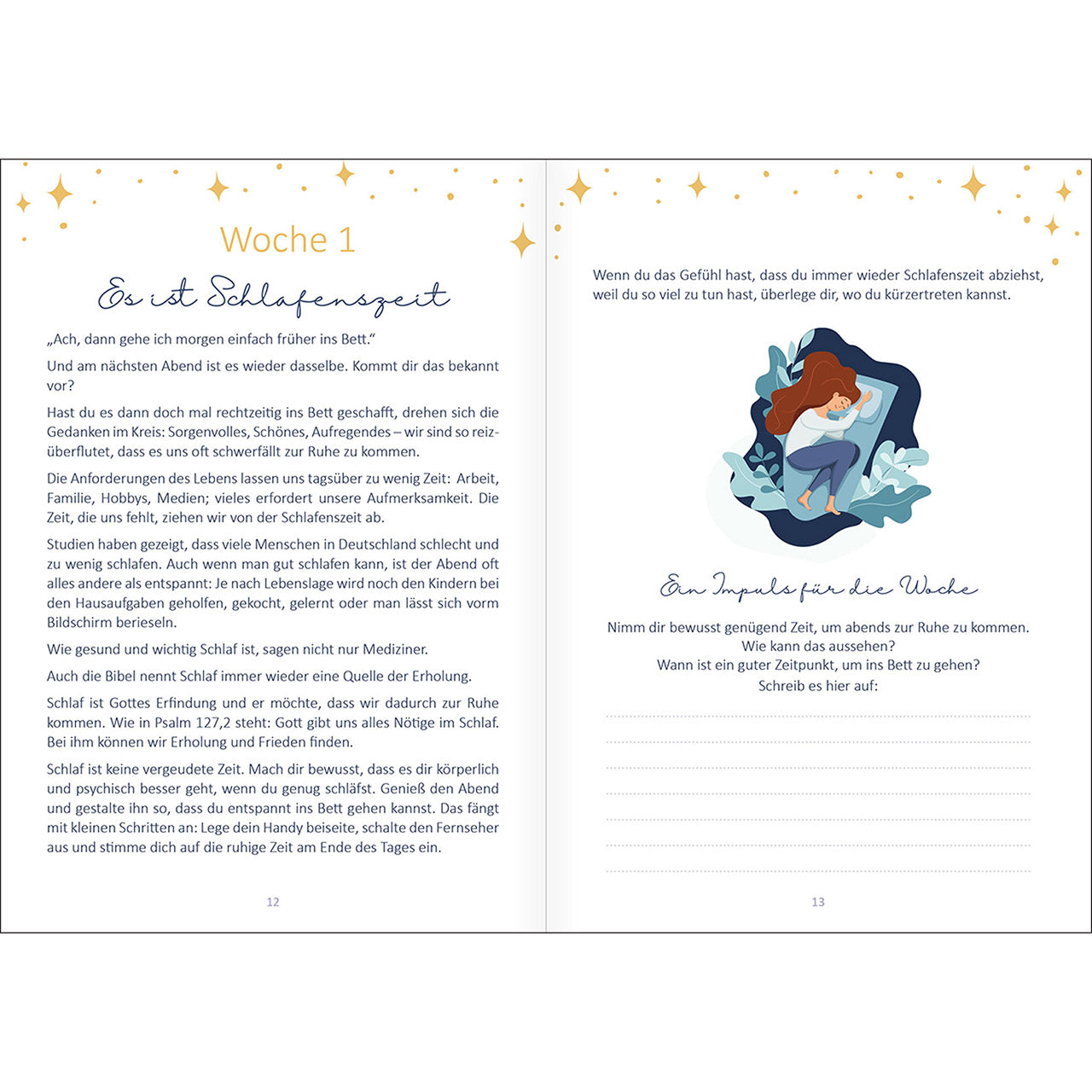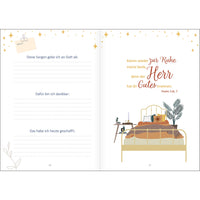 11 Wochen lang lädt Sie der liebevoll gestaltete Begleiter Abend für Abend ein, ihm alles anzuvertrauen, was Sie den Tag über beschäftigt hat. Wöchentliche Impulse geben Ihnen wertvolle Tipps, wie Sie besser schlafen können und stärken Ihr Gottvertrauen. 7 Tage lang helfen Ihnen Stichworte, Gedanken zu ordnen und mit wenig Aufwand zu notieren.