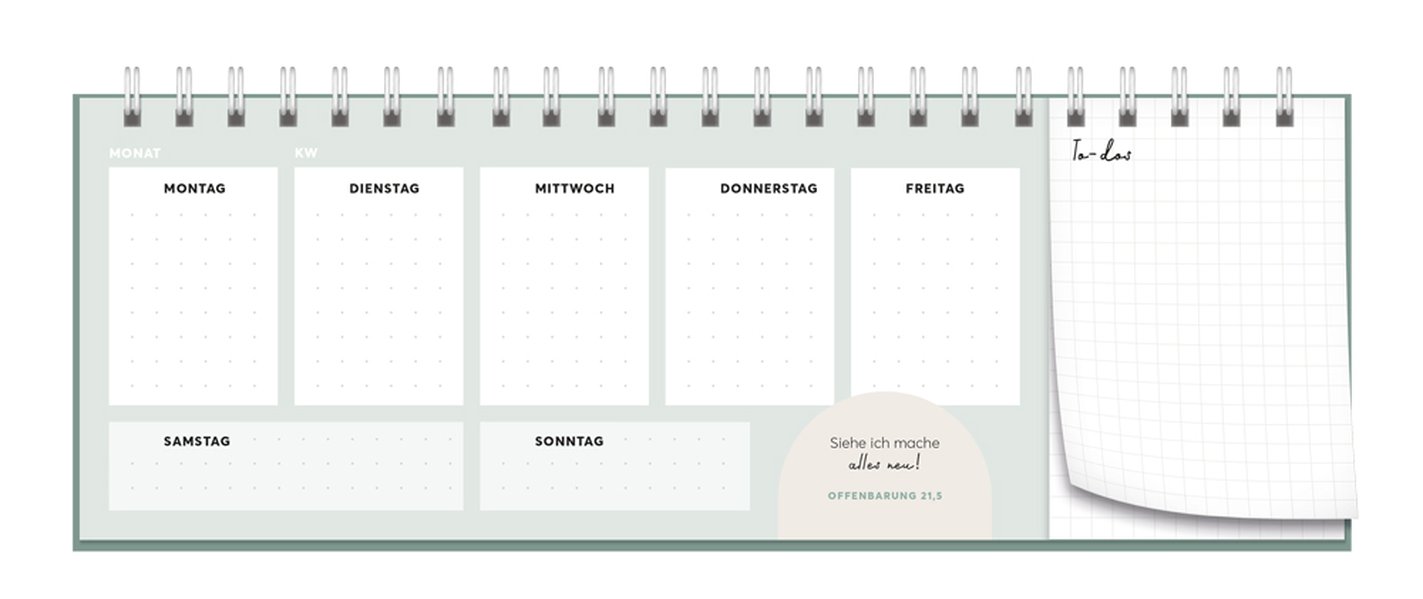 Jede Seite ist liebevoll gestaltet mit Bibelversen, die Mut machen und Orientierung schenken. Raum für To-dos, Notizen und kleine Dankbarkeitsmomente laden dazu ein, jede Woche bewusst zu erleben. Die flexible Gestaltung erlaubt eigene Datierung: perfekt, um jederzeit in eine neue Woche zu starten - ein Begleiter, der hilft, Prioritäten zu setzen und das Herz auf das Wesentliche auszurichten.