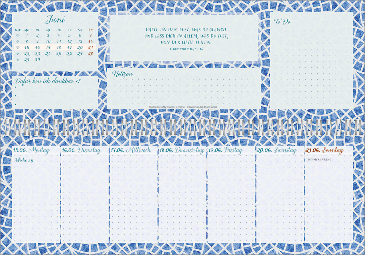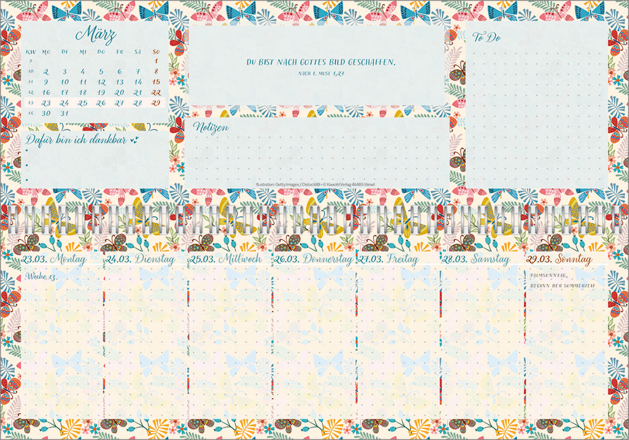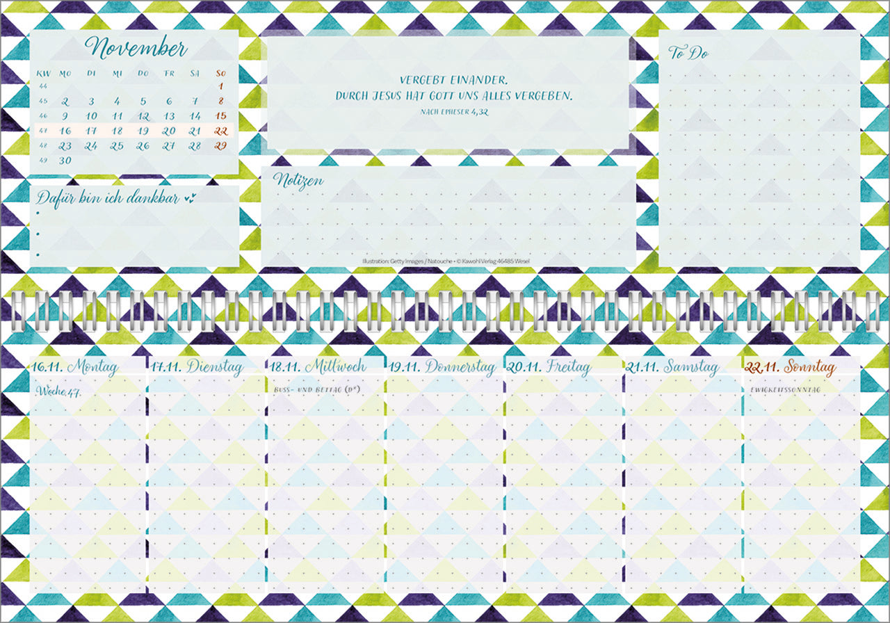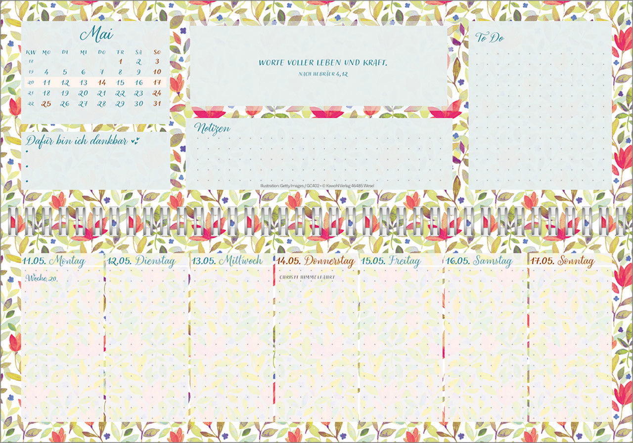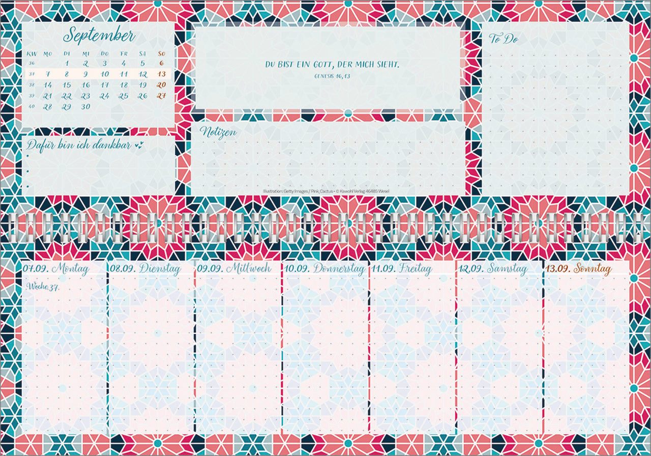 Wöchentliche Bibelverse oder christliche Zitate geben wertvolle Denkanstöße und die farbenfrohen Muster sind ein echter Blickfang.