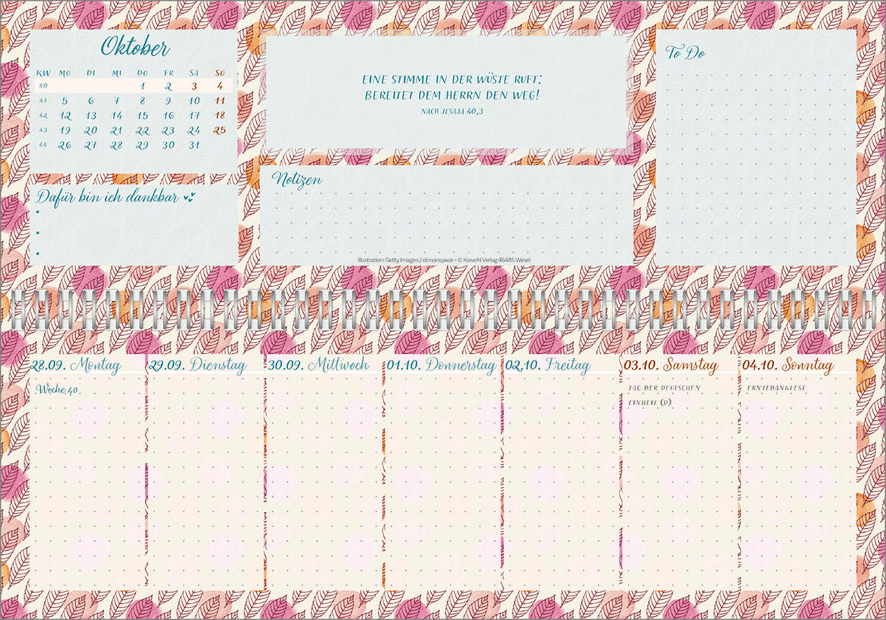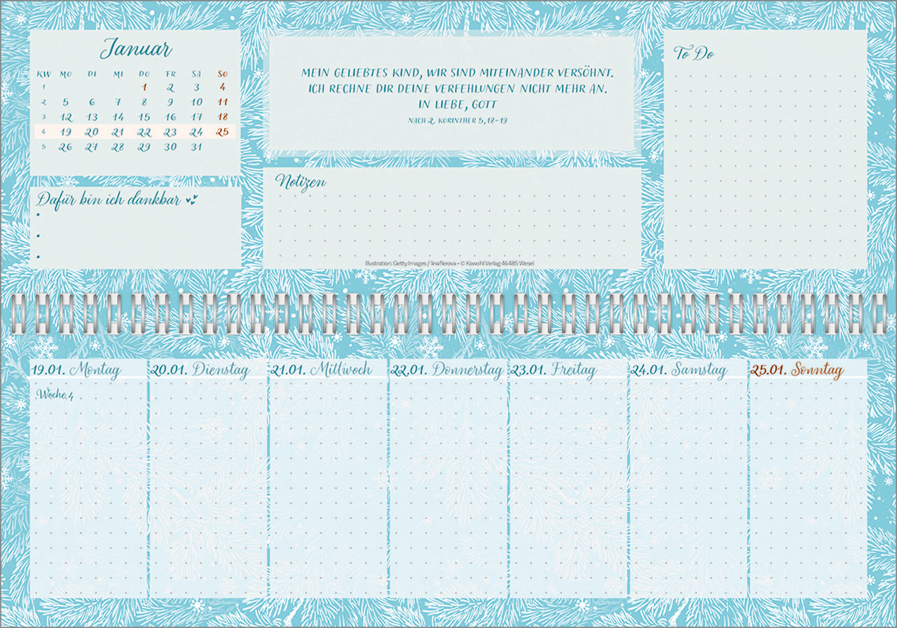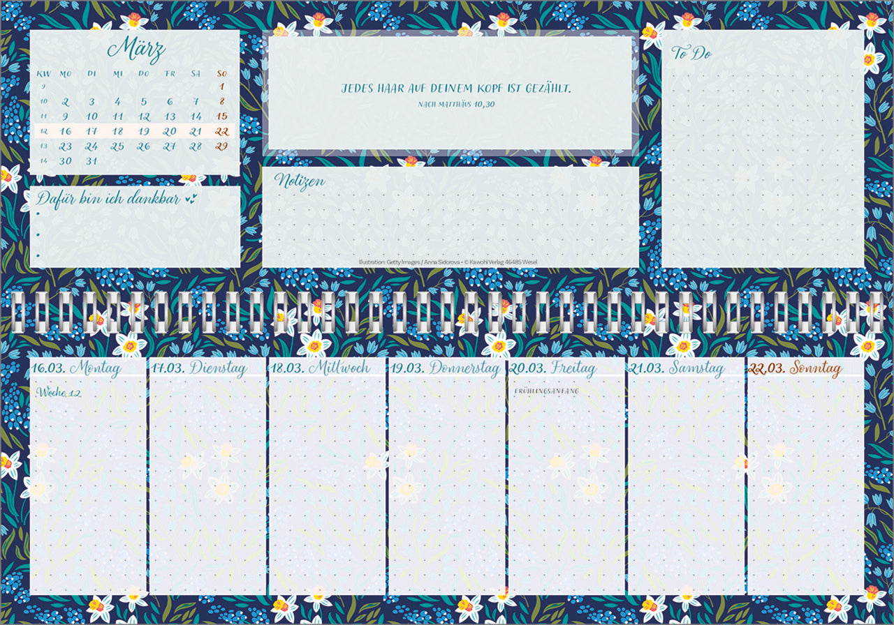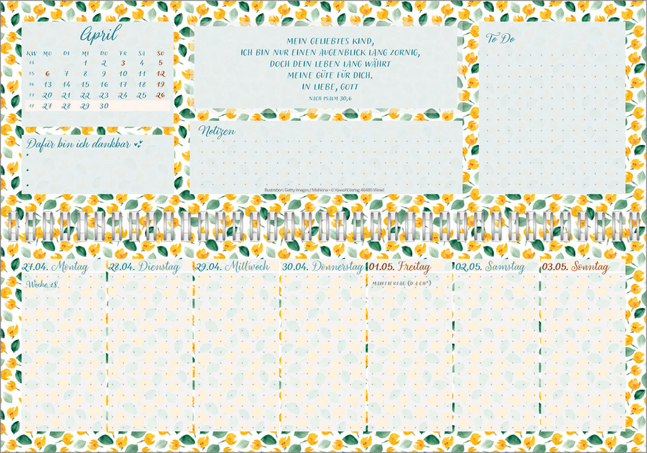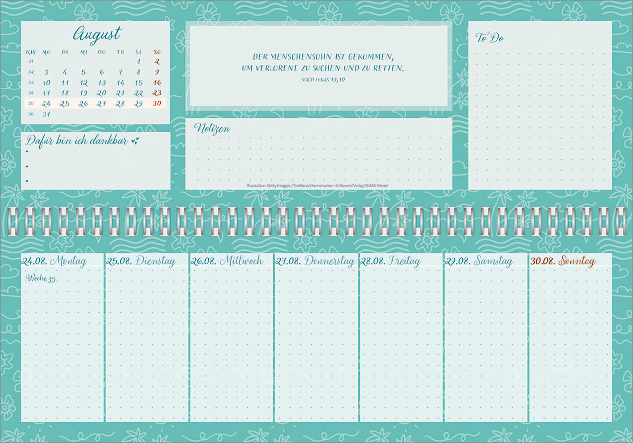 Wöchentliche Bibelverse oder christliche Zitate geben wertvolle Denkanstöße und die farbenfrohen Muster sind ein echter Blickfang.