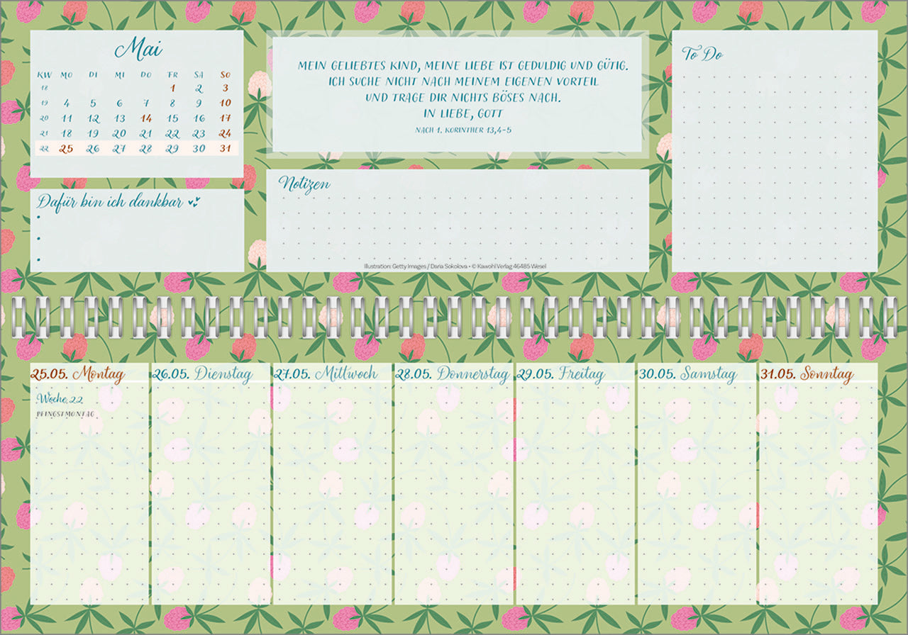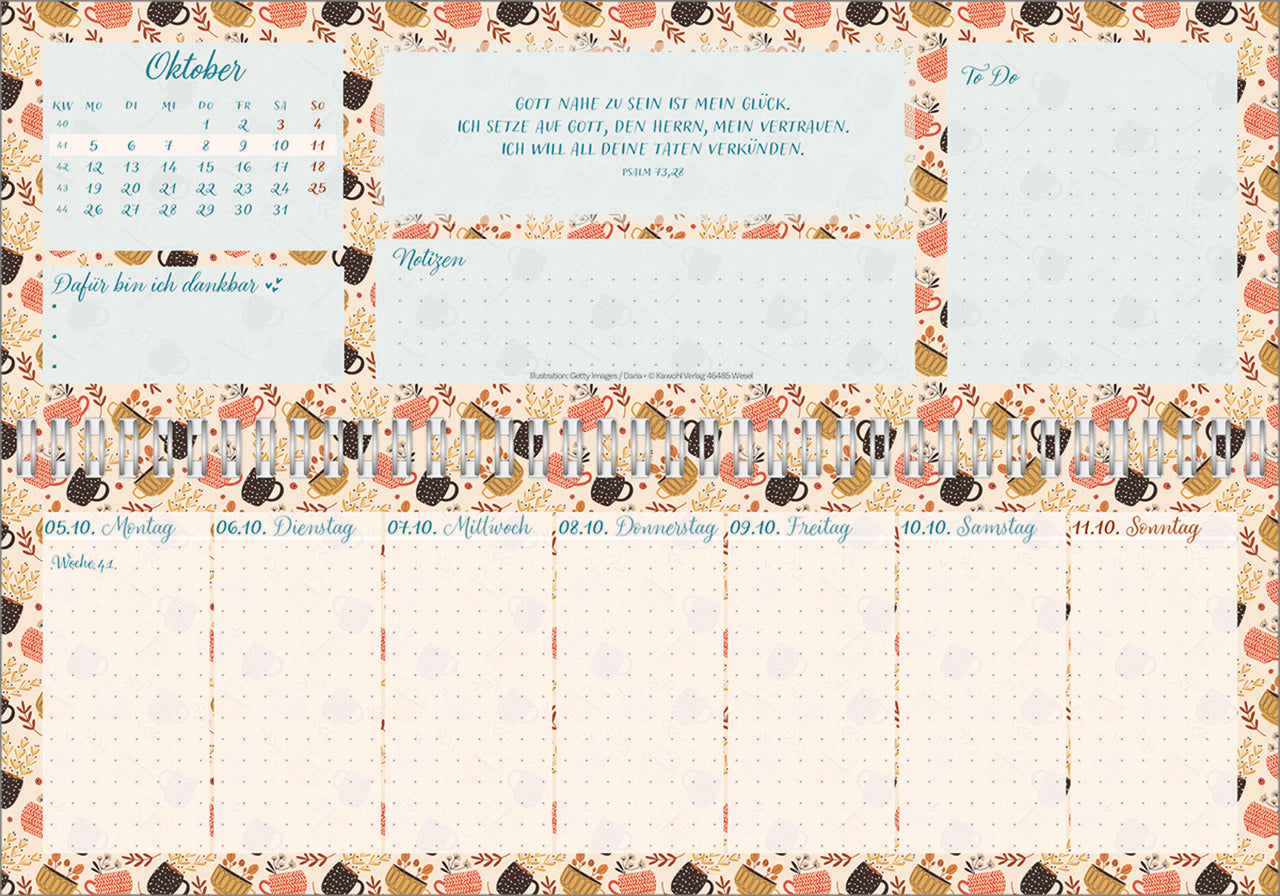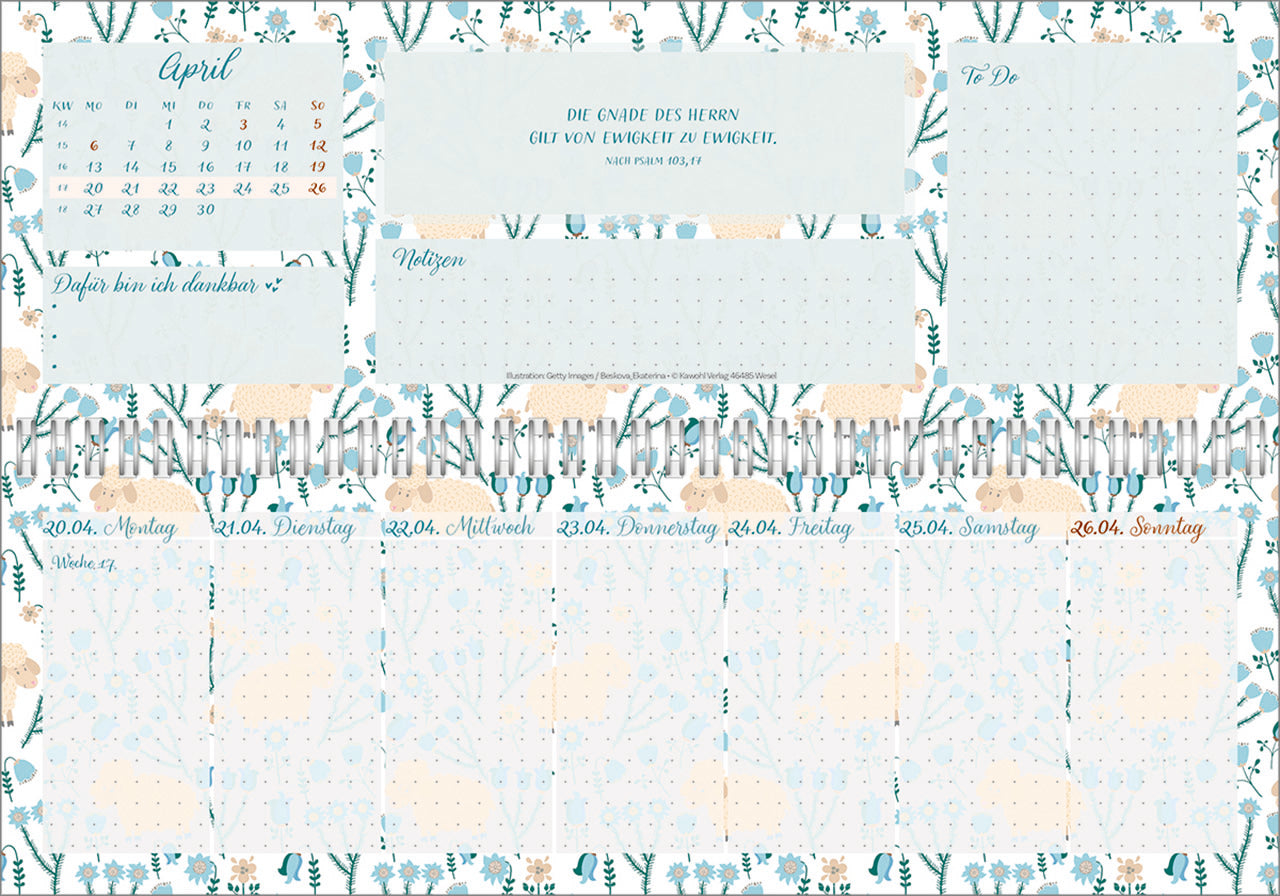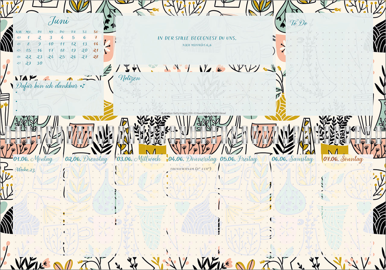 Wöchentliche Bibelverse oder christliche Zitate geben wertvolle Denkanstöße und die farbenfrohen Muster sind ein echter Blickfang.