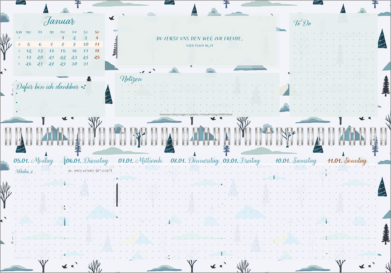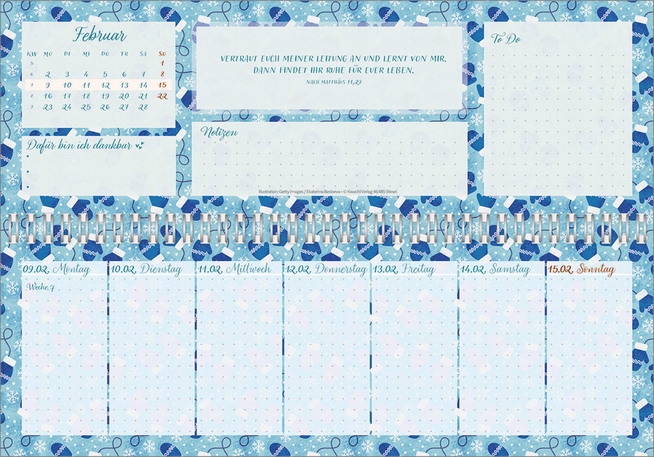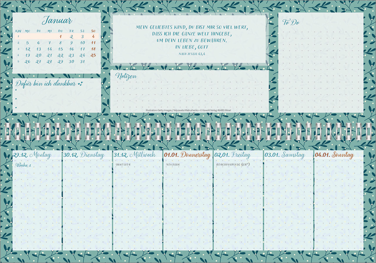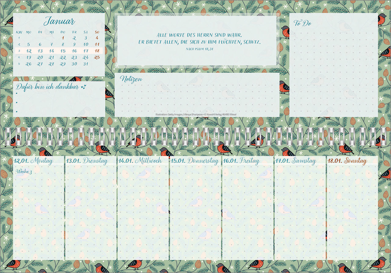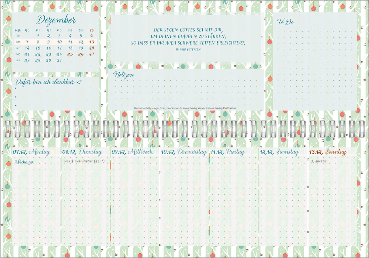 Wöchentliche Bibelverse oder christliche Zitate geben wertvolle Denkanstöße und die farbenfrohen Muster sind ein echter Blickfang.