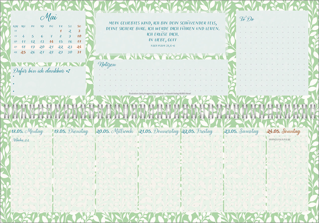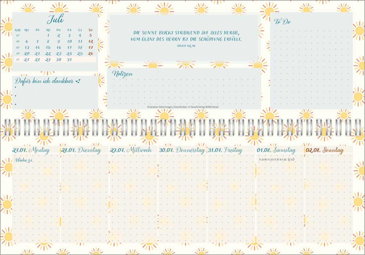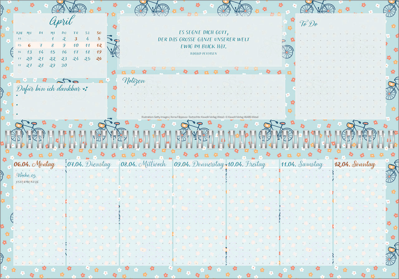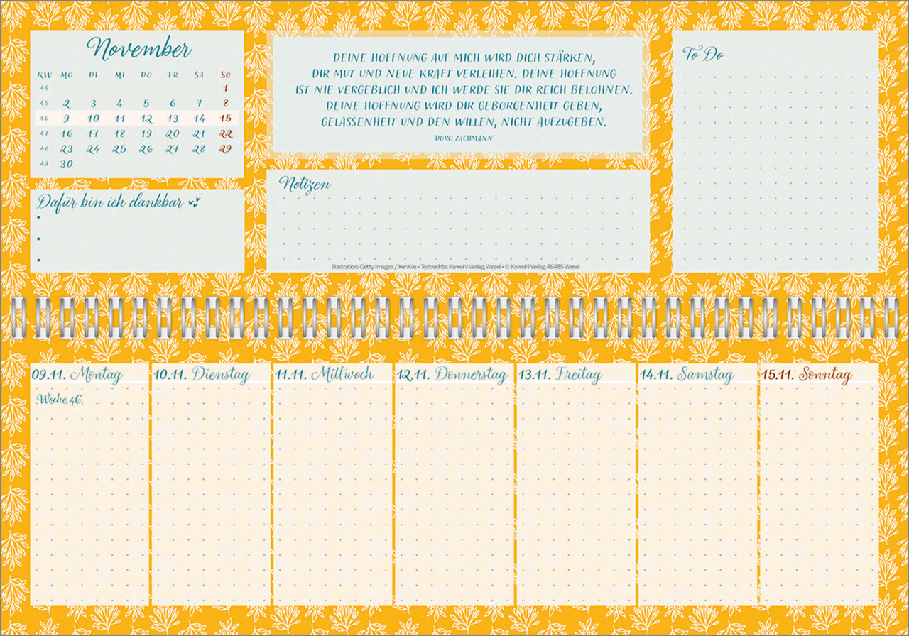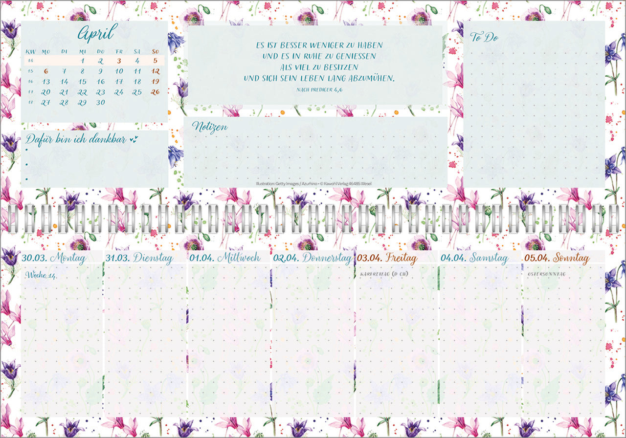 Die klare Wochenstruktur bietet viel Platz für Notizen und eine To-Do-Liste, während ein besonderer Bereich dazu einlädt, Momente der Dankbarkeit bewusst festzuhalten und den Blick auf das Positive zu richten.