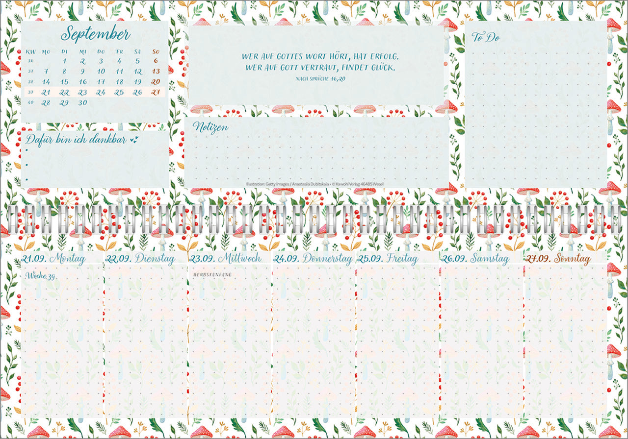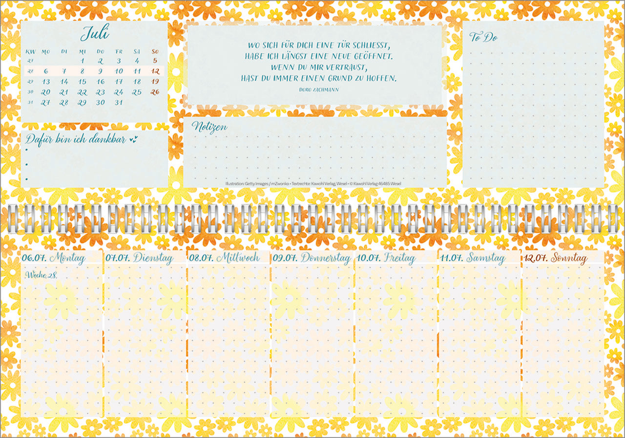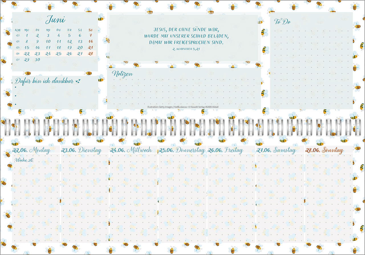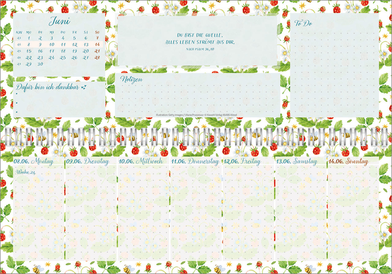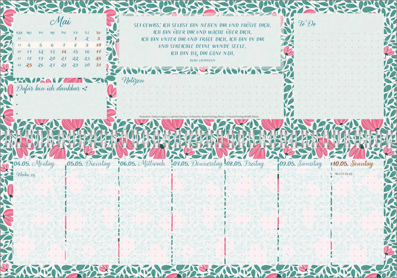 Die klare Wochenstruktur bietet viel Platz für Notizen und eine To-Do-Liste, während ein besonderer Bereich dazu einlädt, Momente der Dankbarkeit bewusst festzuhalten und den Blick auf das Positive zu richten.