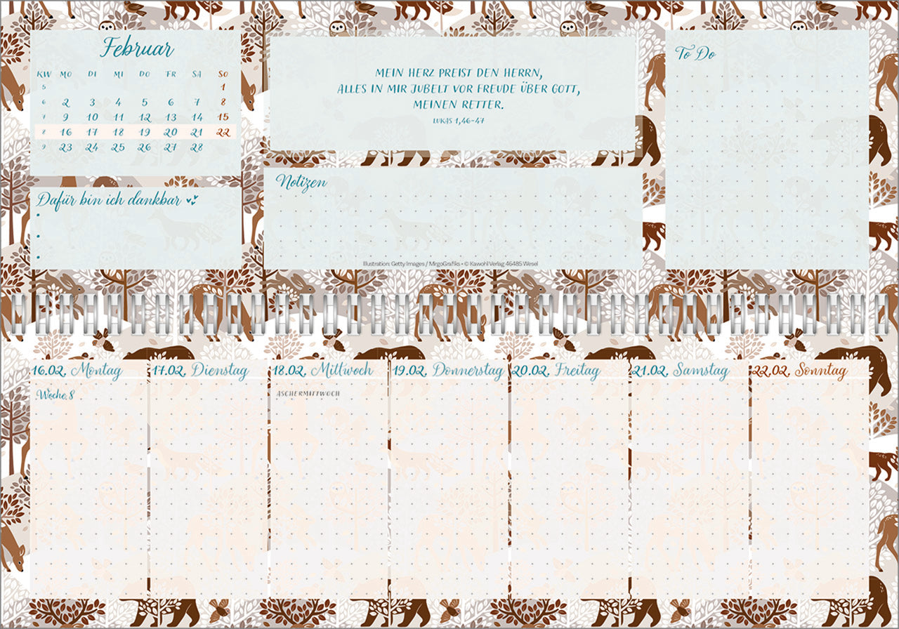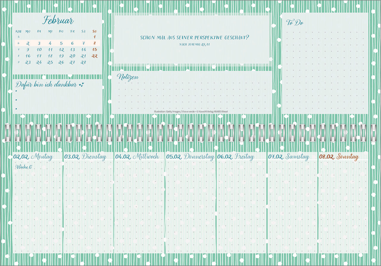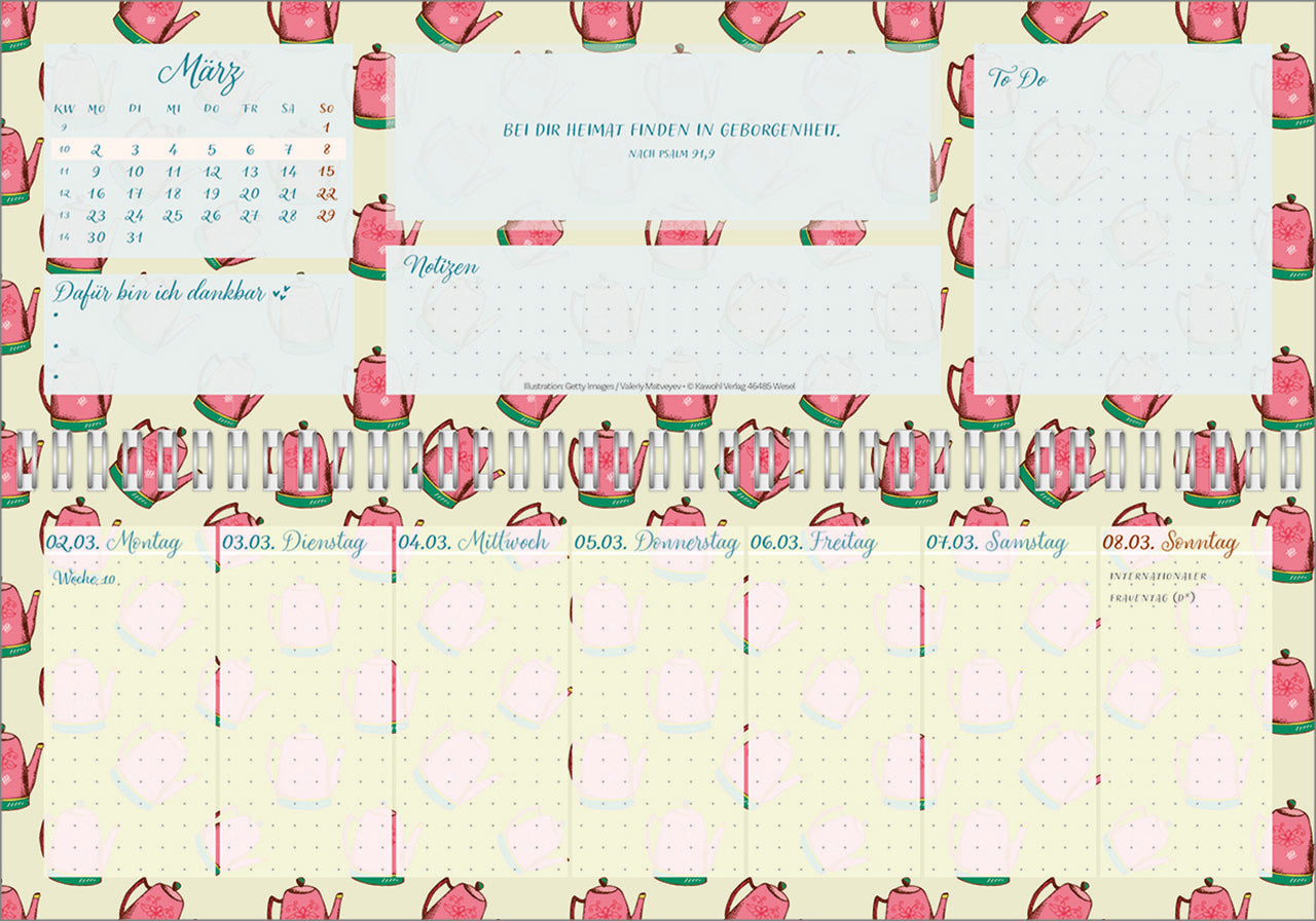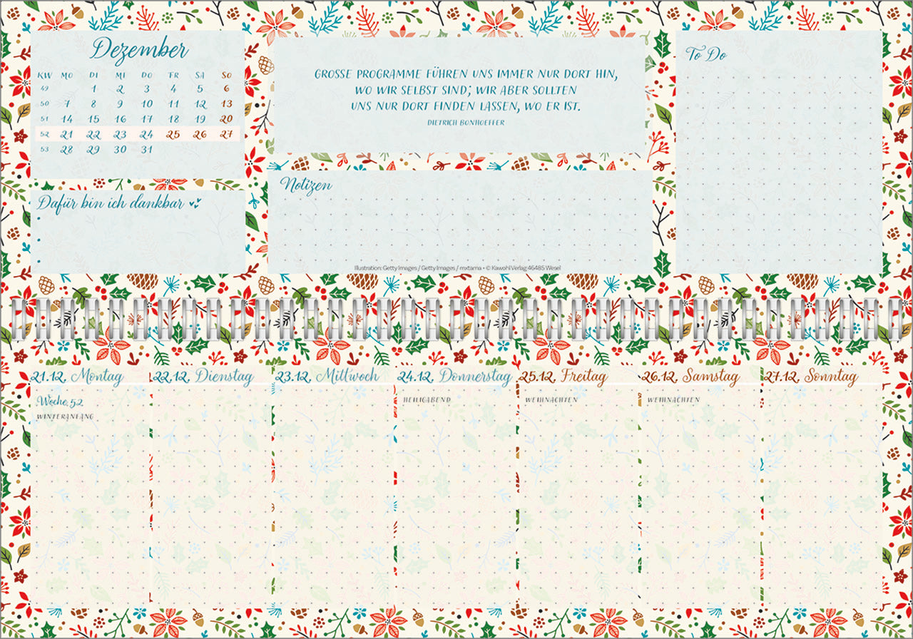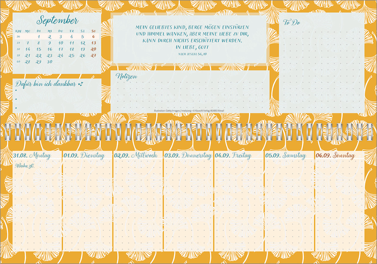Die klare Wochenstruktur bietet viel Platz für Notizen und eine To-Do-Liste, während ein besonderer Bereich dazu einlädt, Momente der Dankbarkeit bewusst festzuhalten und den Blick auf das Positive zu richten.
