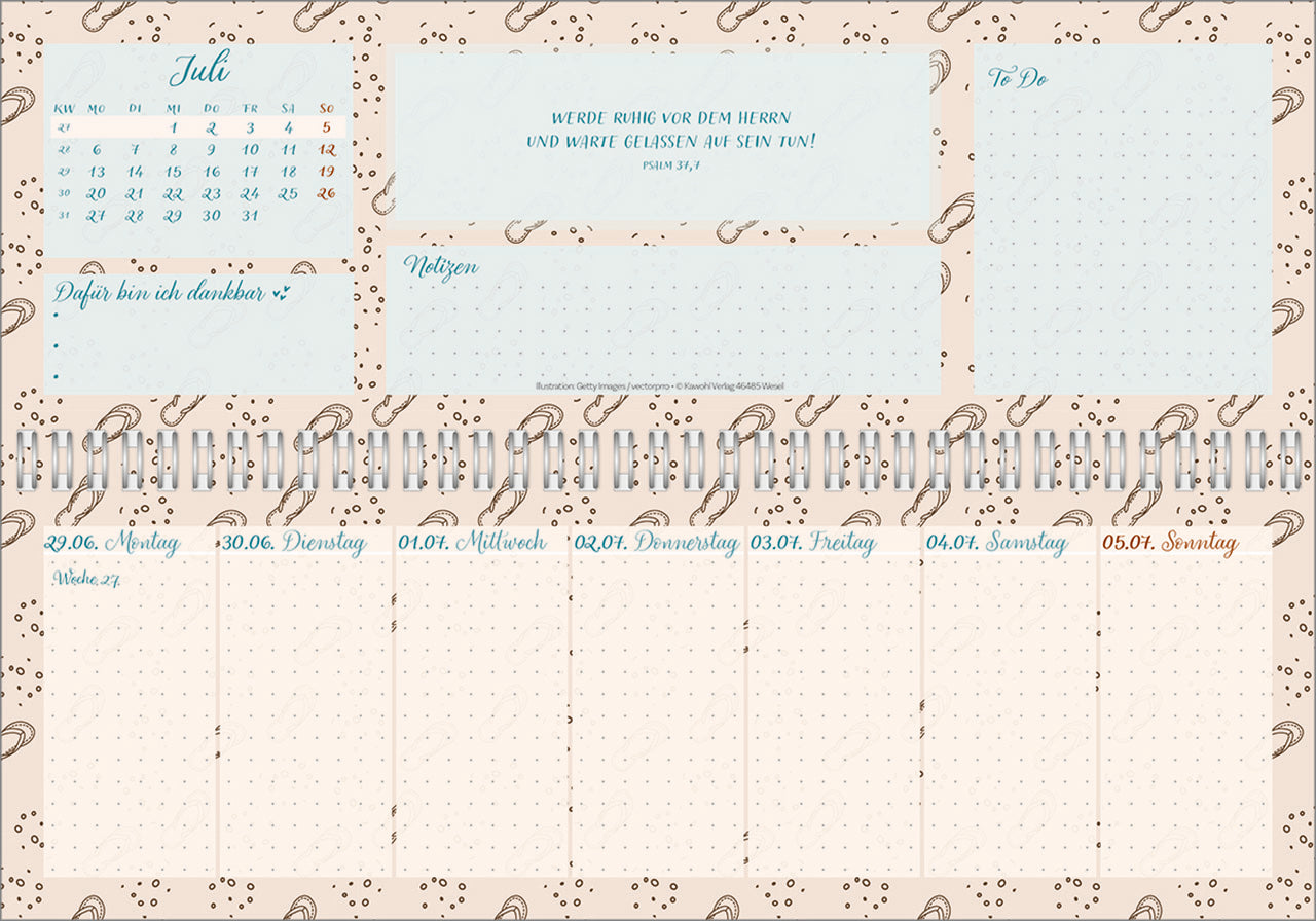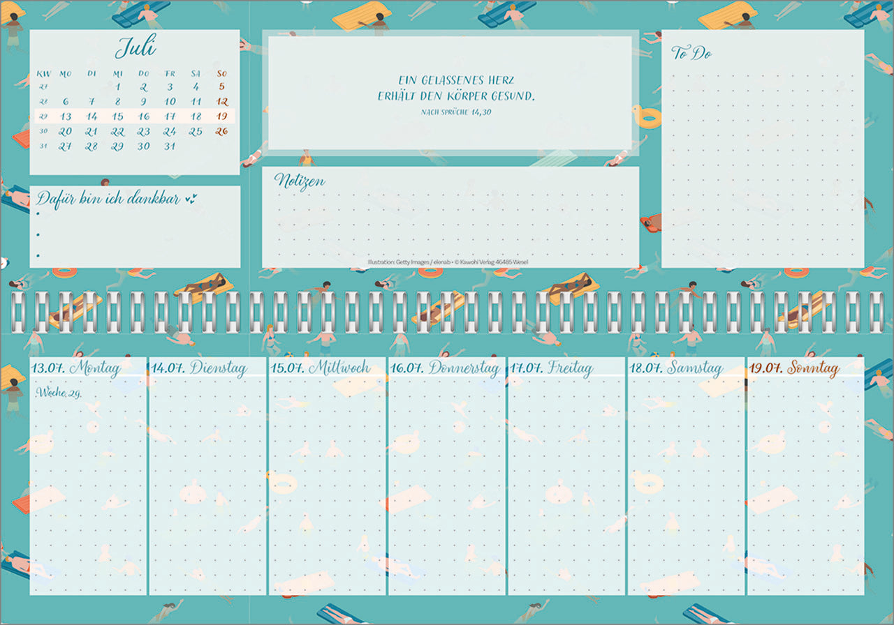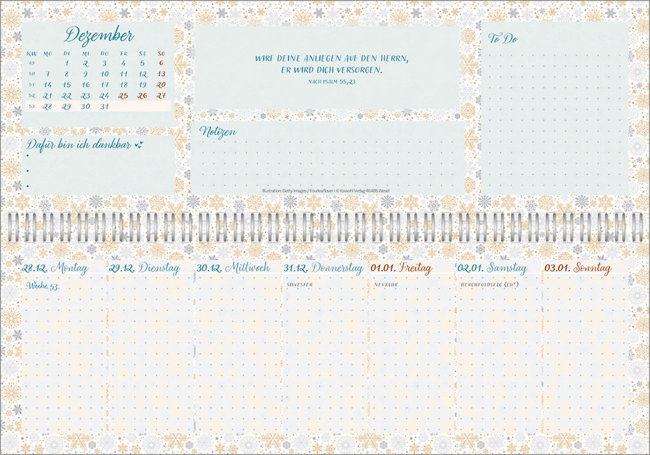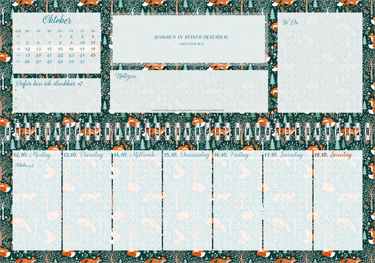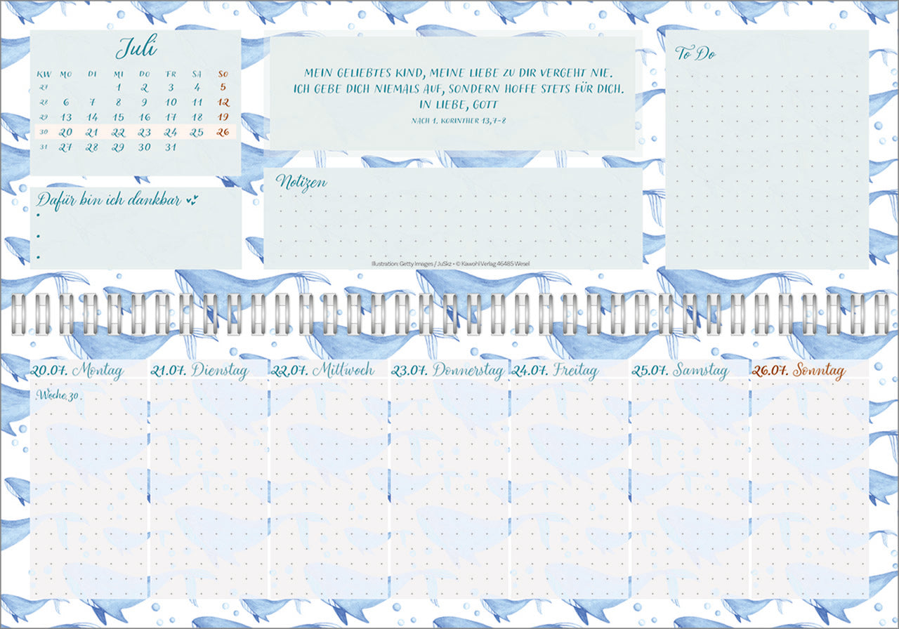 Die klare Wochenstruktur bietet viel Platz für Notizen und eine To-Do-Liste, während ein besonderer Bereich dazu einlädt, Momente der Dankbarkeit bewusst festzuhalten und den Blick auf das Positive zu richten.