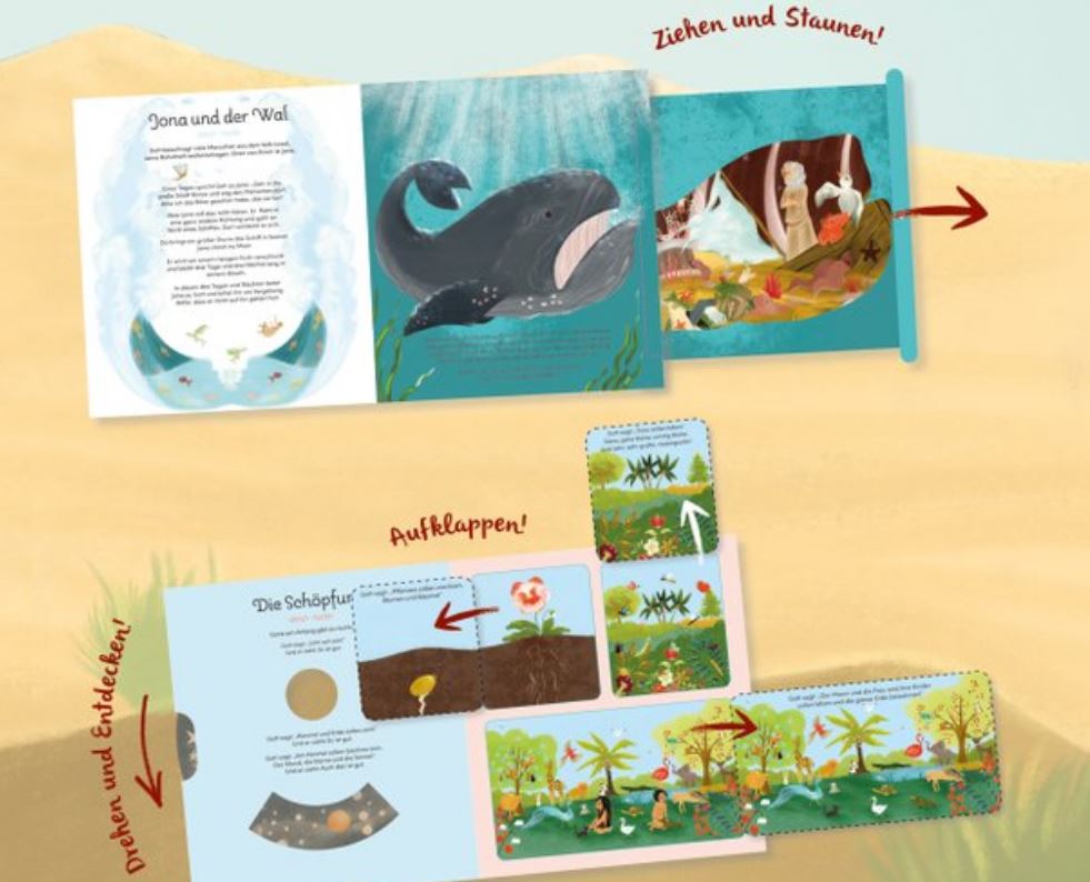 Die Dreh-, Klapp-, Popup- und Ziehelemente sind der ganz besondere Clou dieser liebevoll nacherzählten und farbenfroh illustrierten Kinderbibel.