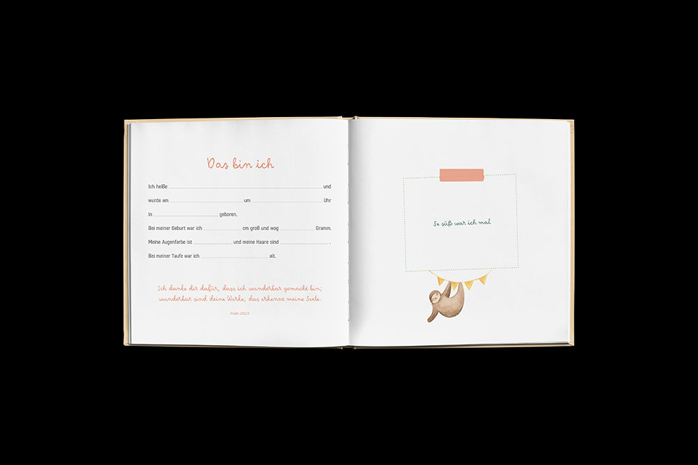 Ergänzend finden sich im Album noch kurze Zitate, Bibelverse, Segensworte und Kindergebete. Am Schluss ist auch noch Raum, um die ersten Fortschritte des Kindes festzuhalten.