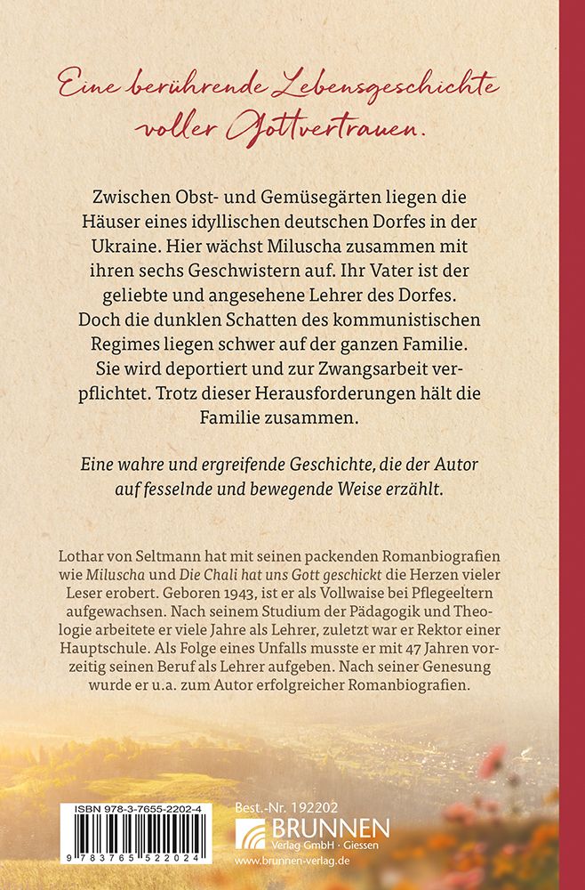 Zwischen Obst- und Gemüsegärten liegen die Häuser des idyllischen deutschen Dorfes in der Ukraine. Hier wächst Miluscha zusammen mit ihren sechs Geschwistern auf. Ihr Vater ist der geliebte und angesehene Lehrer des Dorfes. Doch die dunklen Schatten des kommunistischen Regimes liegen schwer auf der ganzen Familie. Sie wird deportiert und zur Zwangsarbeit verpflichtet. Trotz dieser Herausforderungen hält die Familie zusammen. Doch der Vater ist den Strapazen auf Dauer nicht gewachsen. Es sind seine letzten Worte, als Segen gesprochen, die Miluscha all die Jahre hindurch begleiten und tragen.