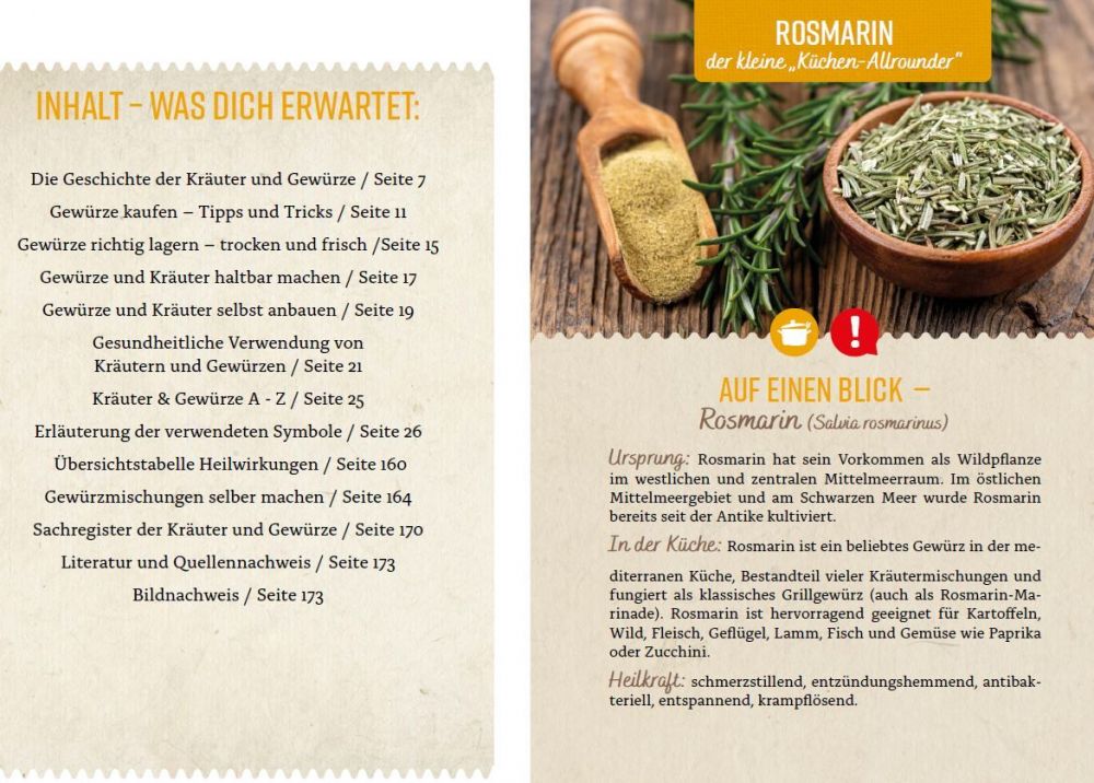Der neue Ratgeber und Geschenkband rund um das Thema Kräuter und Gewürze von Sina Butennuth enthält ausführliche Einzeldarstellungen der ca. 40 wichtigsten Kräuter und Gewürze. Dazu kommen praktische Tipps zu Beschaffung, Lagerung und Einsatzmöglichkeiten.