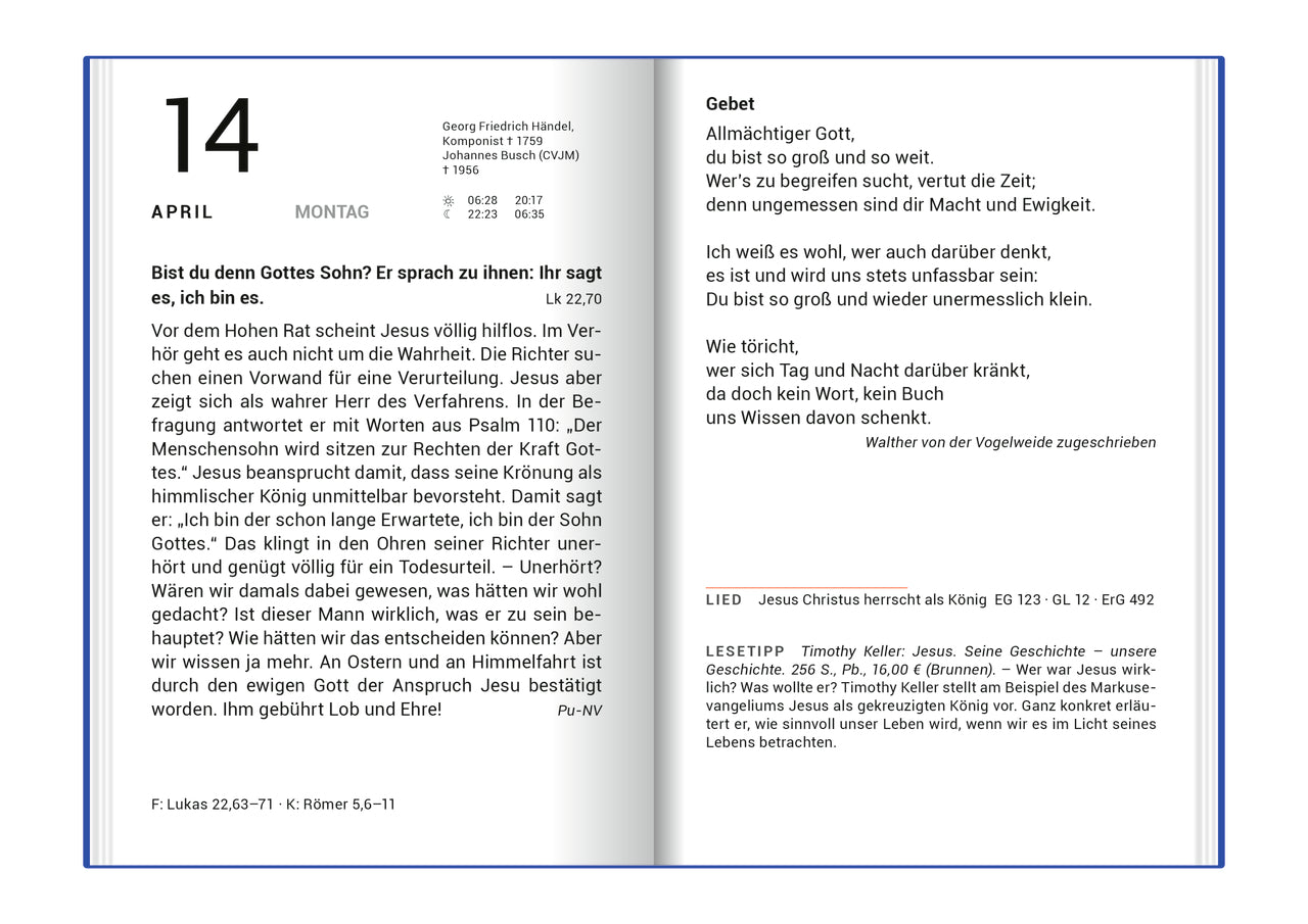 Für Leseliebhaber: Die lesefreundliche Schrift und der großzügige Satz der Großen Buchausgabe eignen sich besonders gut zum entspannten Lesen. Die feste Bindung sorgt für Schutz und ein hochwertiges Äußeres. Für jeden Tag gibt es eine großzügige Doppelseite. Auch ein Lesebändchen zum Markieren der aktuellen Seite ist enthalten.