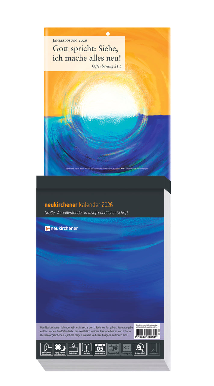 Der Neukirchener Kalender ist für viele Bibelleserinnen und -leser ein unverzichtbarer Impuls für den Tag! Über 200 Mitarbeitende aus fünf Ländern und verschiedenen christlichen Kirchen sorgen dafür, dass dieser traditionsreiche Andachts- und Bibellesekalender für einen offenen und lebensnahen Glauben steht. Besonders machen ihn seine beiden täglichen Texte: Im ersten wird der Bibeltext des Ökumenischen Bibelleseplans erschlossen und im zweiten mit einer alltagsnahen Erzählung, einem Impuls oder einem Gebet veranschaulicht. Ergänzt werden die Texte mit Liedvorschlägen, Jahrestagen besonderer Persönlichkeiten, den beliebten Buchtipps, und den Monatssprüchen.