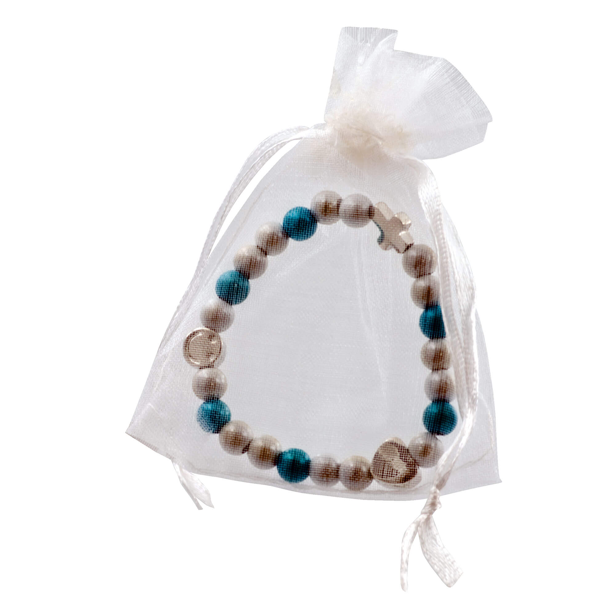 Perlenarmband mit Kreuz "Kinder", schimmernd (türkis-weiß)