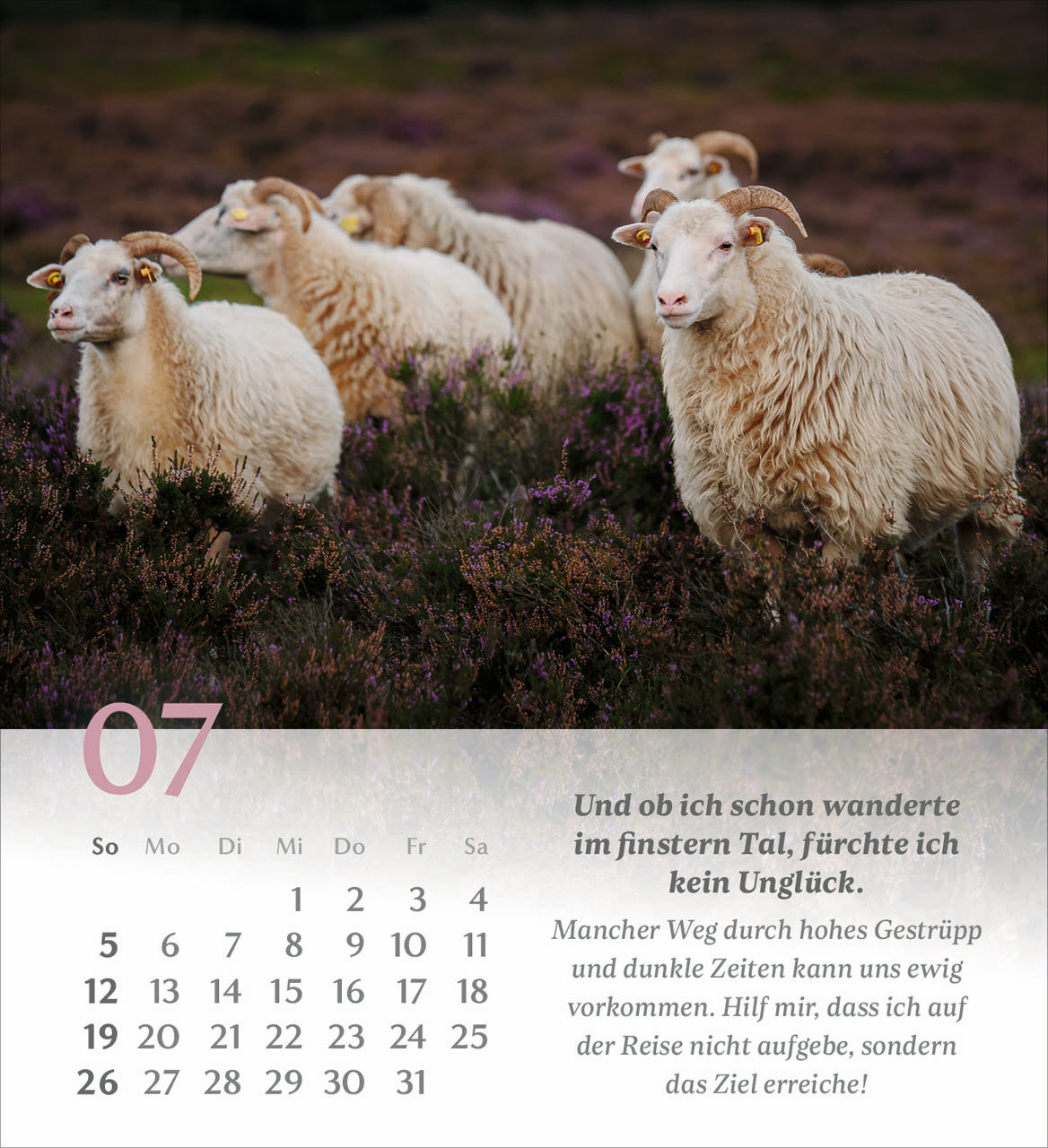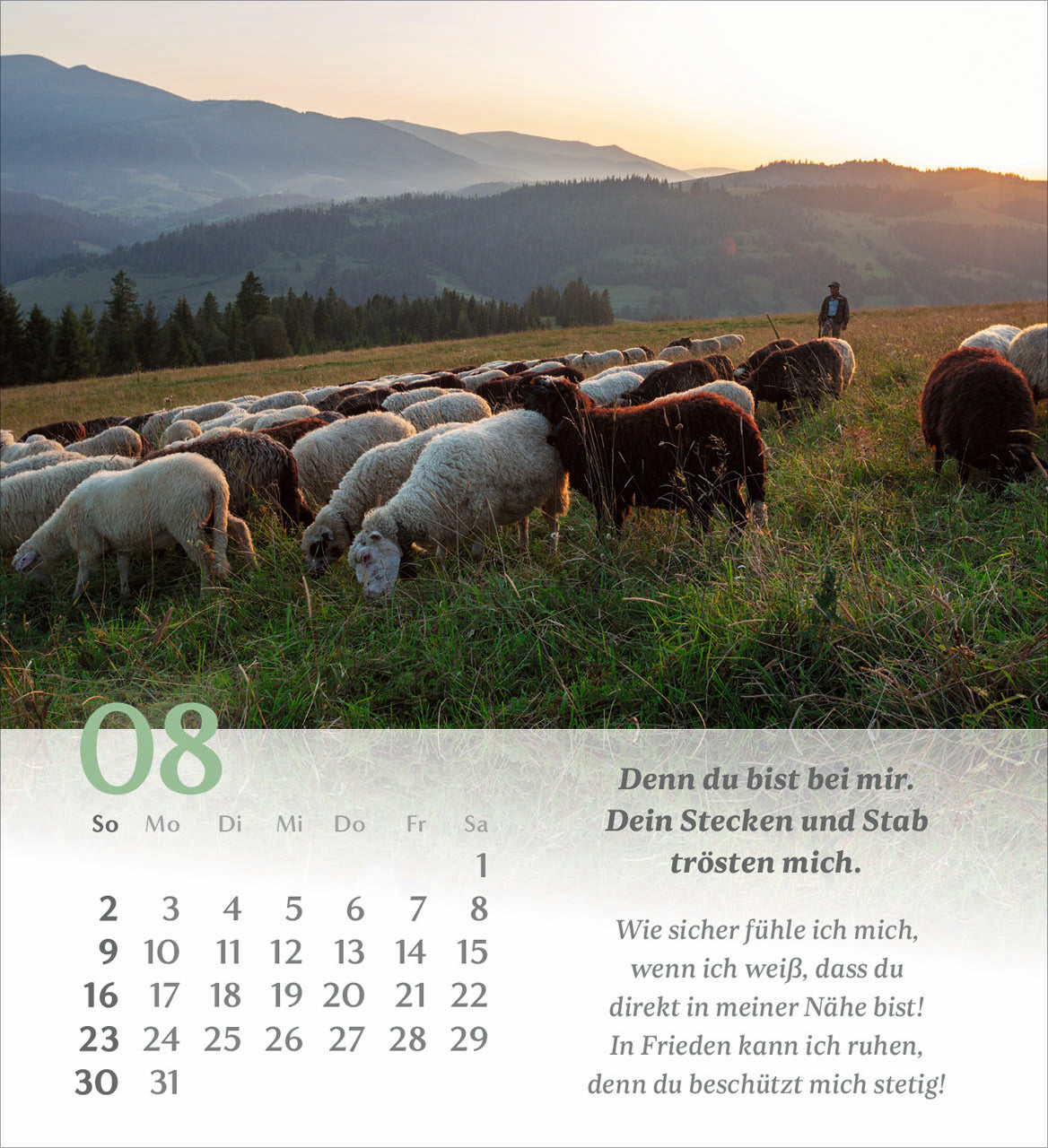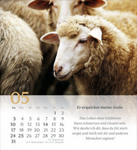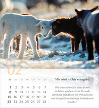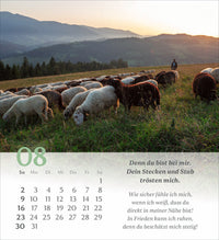 Gehen Sie mit den Gedanken dieses wunderbaren Psalms von König David durch das Jahr. Illustriert werden die Verse mit abwechslungsreichen, symbolischen Bildern, die uns den Psalm 23 näherbringen. Jeder Monat beschäftigt sich mit einem Vers des Psalms.
