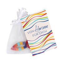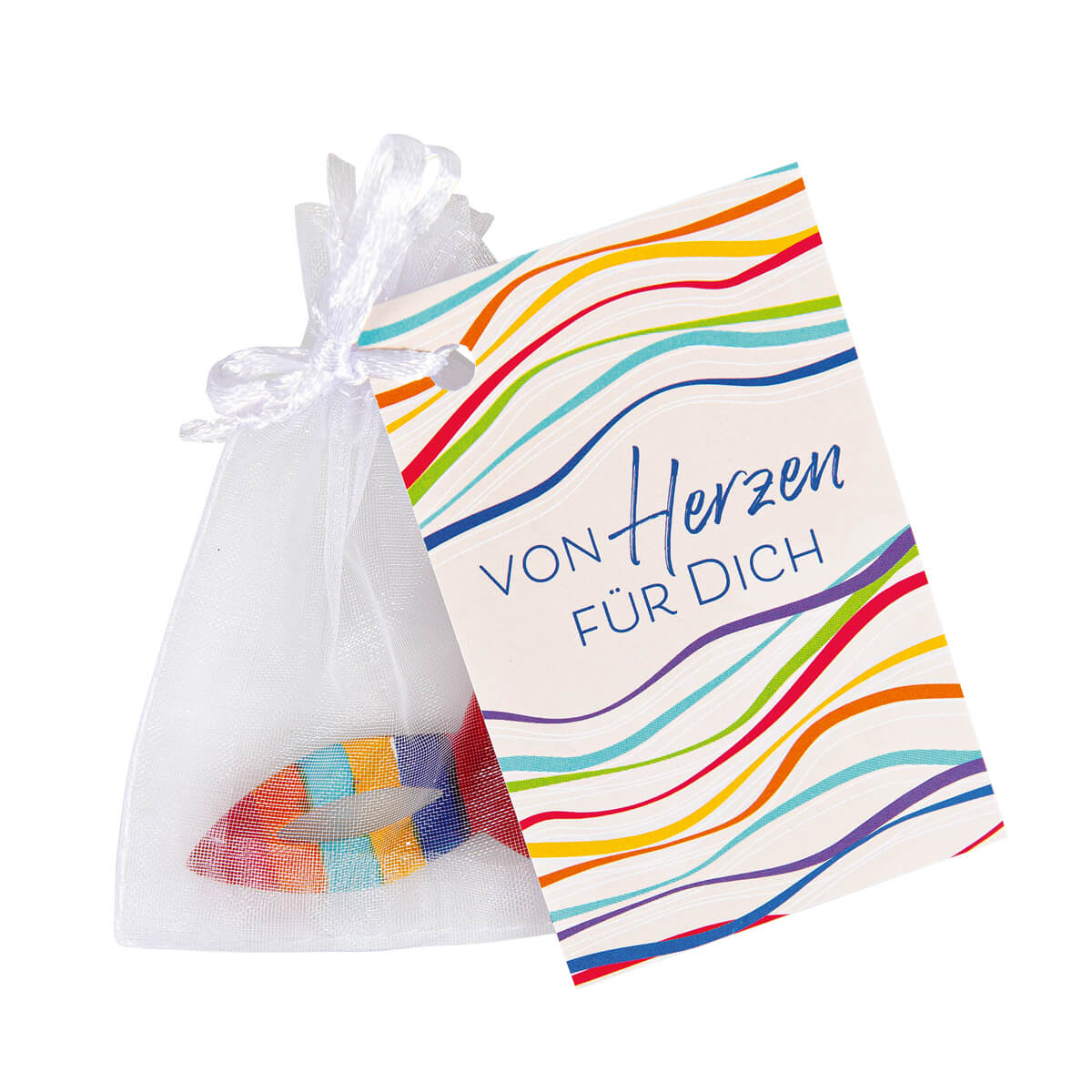 Fertig zum Verschenken im Organzabeutel mit Grußkärtchen verpackt.
