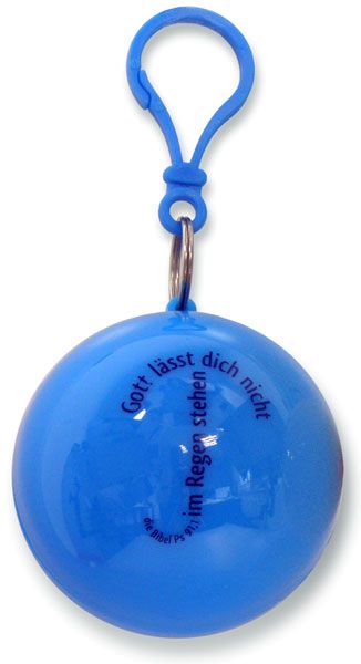 Ein originelles Geschenk: blauer Regenponcho mit Kapuze, verpackt in einer Kugel (7cm) mit Karabiner zum Umhängen, Textaufdruck: "Gott lässt dich nicht im Regen stehen"
