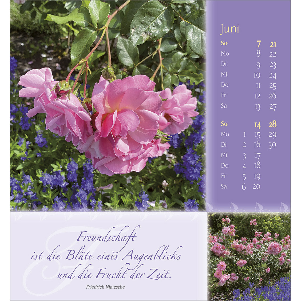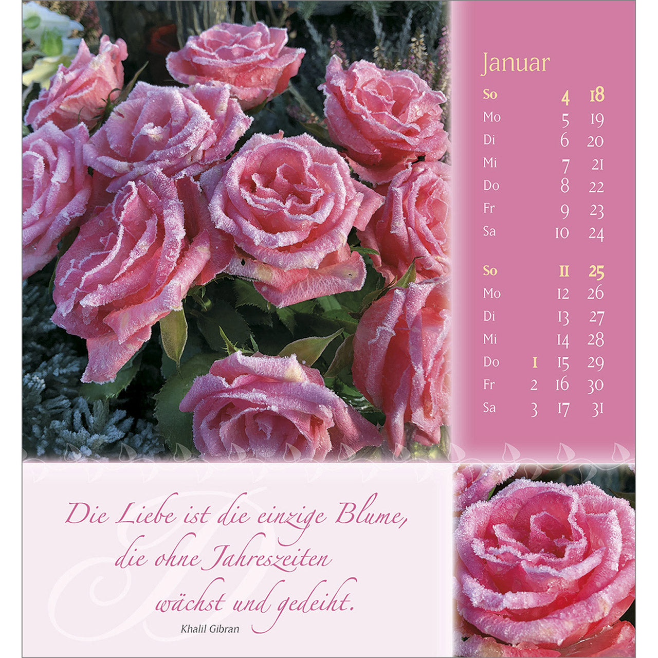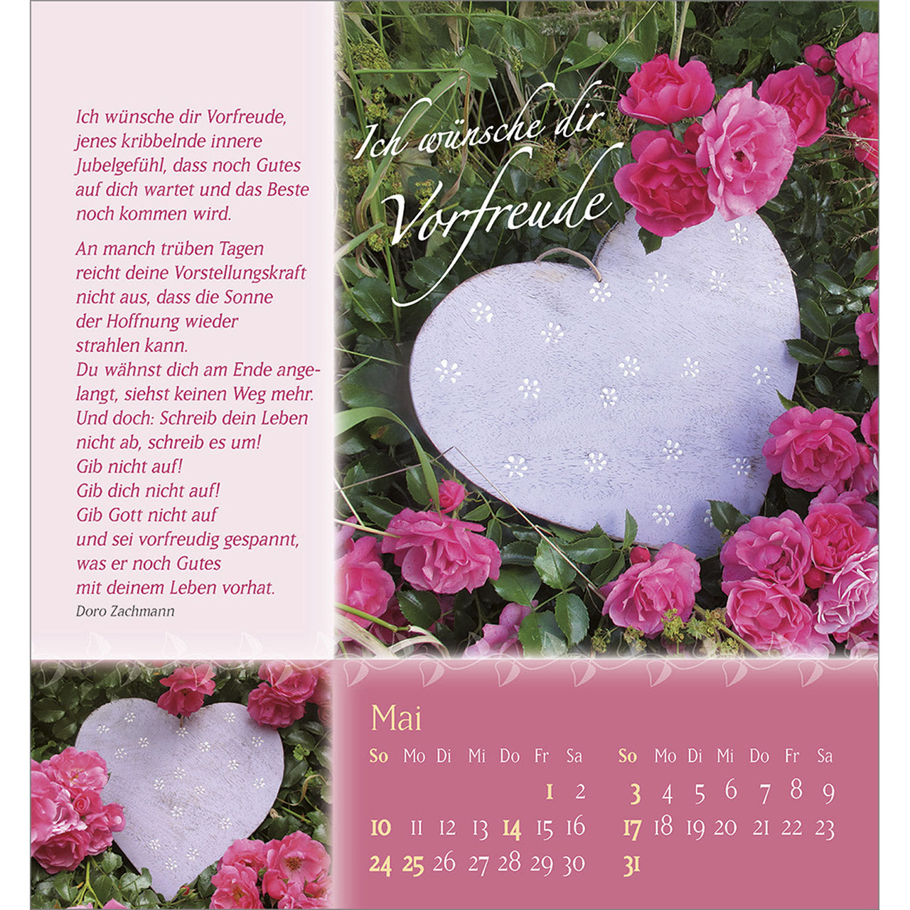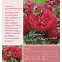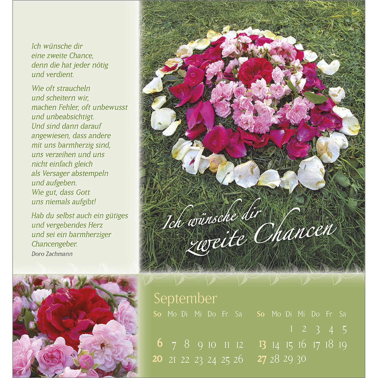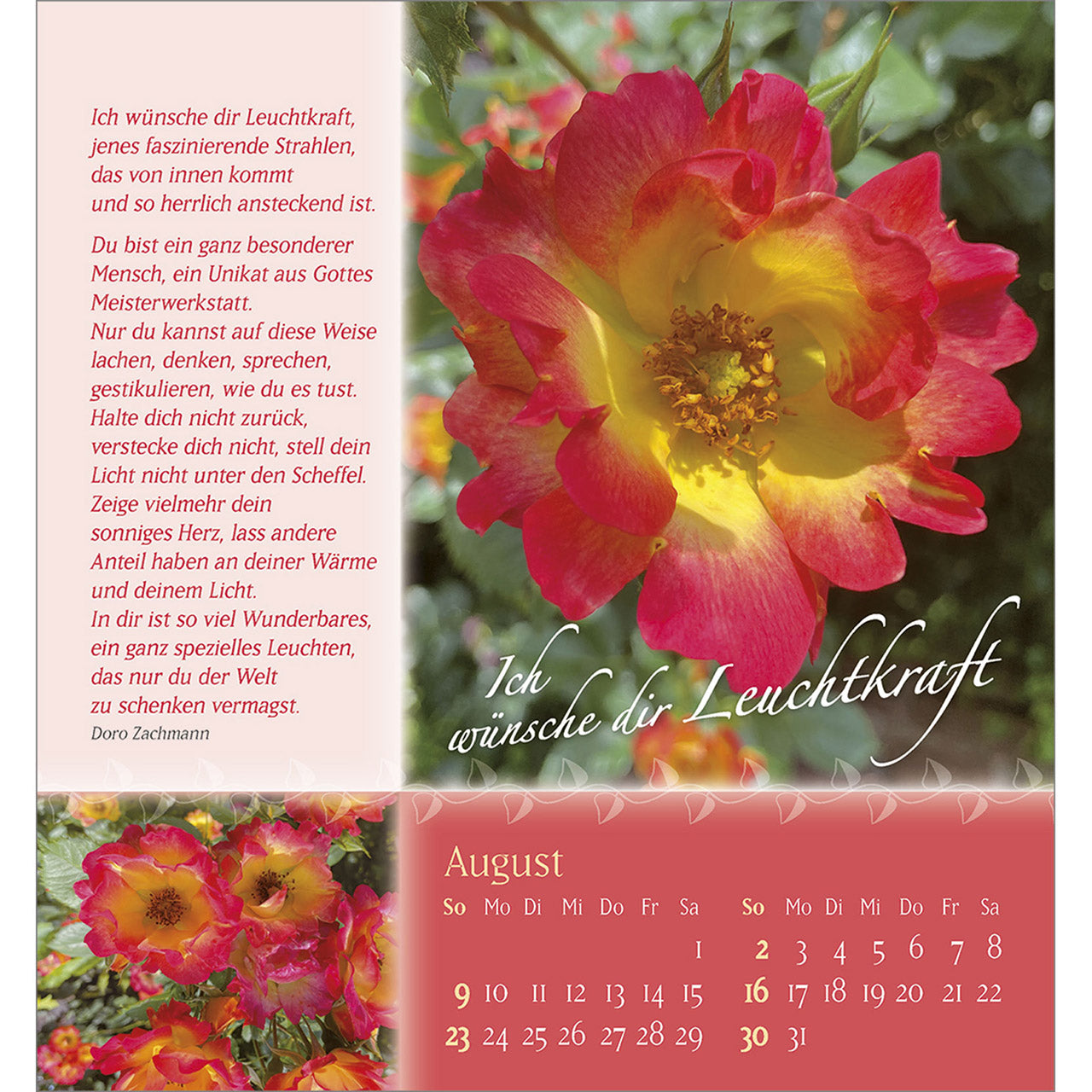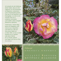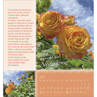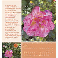 Verschenken Sie Schönheit und Blütenpracht aus Gottes wunderbarem Garten. Wohltuende, lebensnahe Wünsche von Doro Zachmann und verträumte Poesie streicheln die Seele und machen diesen Kalender zu einem Rosengruß für ein ganzes Jahr.