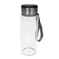 Trinkflasche aus Glas mit schwarzer Thermo-Manschette.