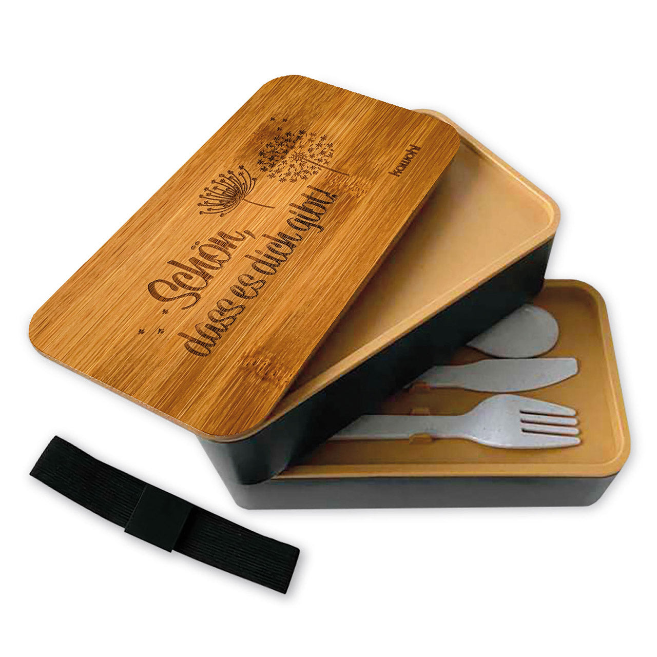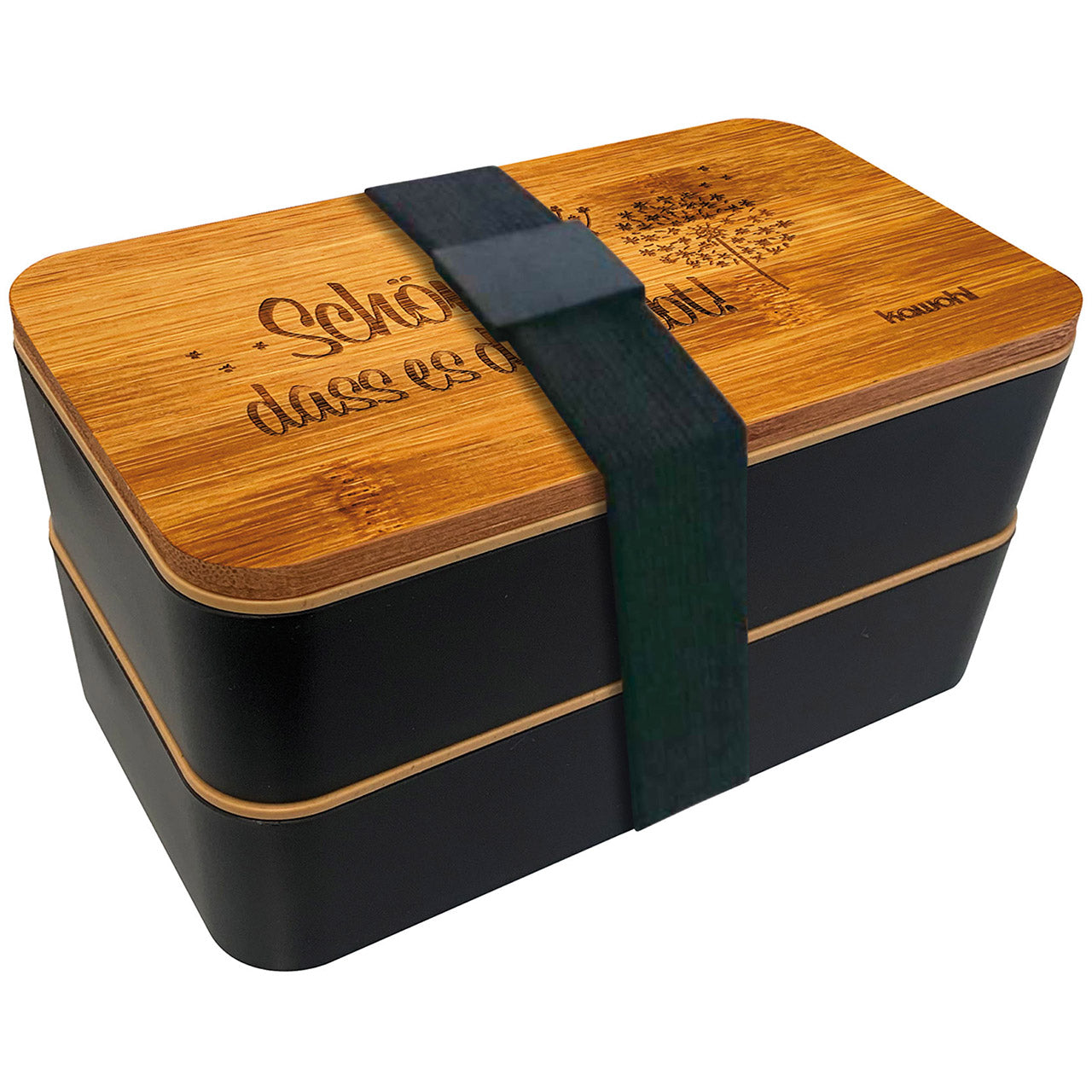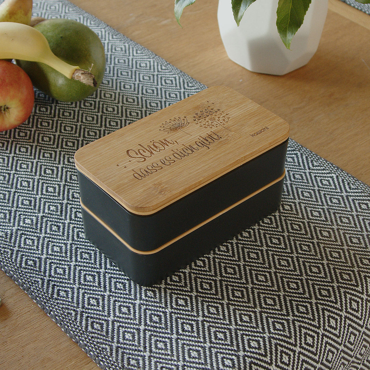 Mit dieser Lunchbox der Extra-Klasse haben Sie alles für die Mahlzeit unterwegs dabei. Sie besteht aus zwei separaten Dosen mit jeweils einem Deckel. Zusätzlich gibt es einen variablen Trenneinsatz sowie Messer, Gabel und Löffel, die zwischen den Etagen verstaut werden. Obenauf liegt noch ein Bambus-Schneidbrett mit dekorativem und ermutigendem Design. Das Schneidebrett ist ein Naturprodukt, jede Maserung ist anders und verleiht so jeder Box ihren individuellen Charme.